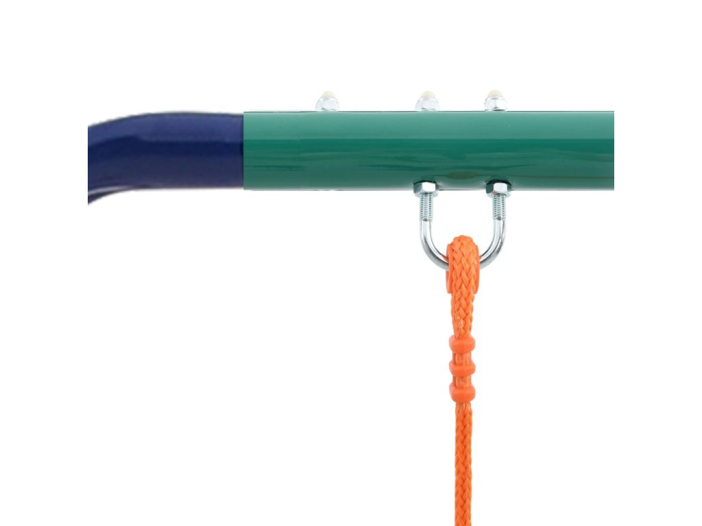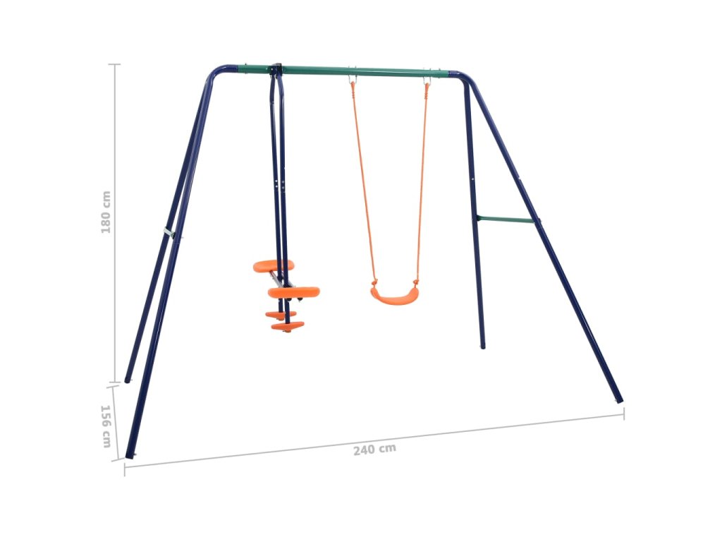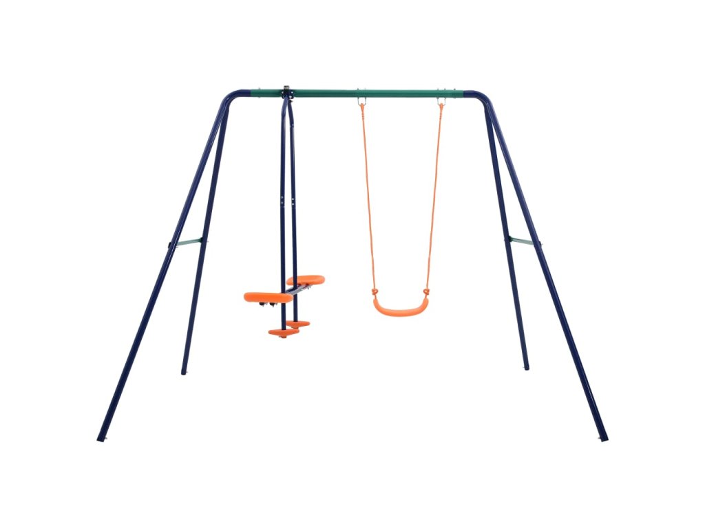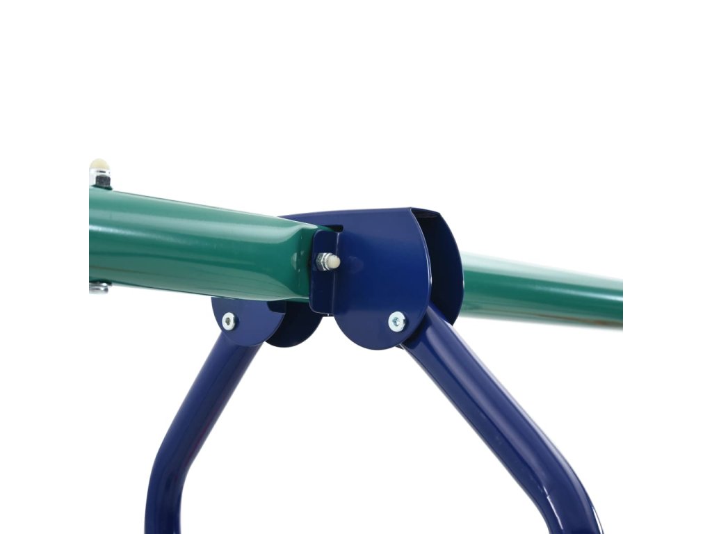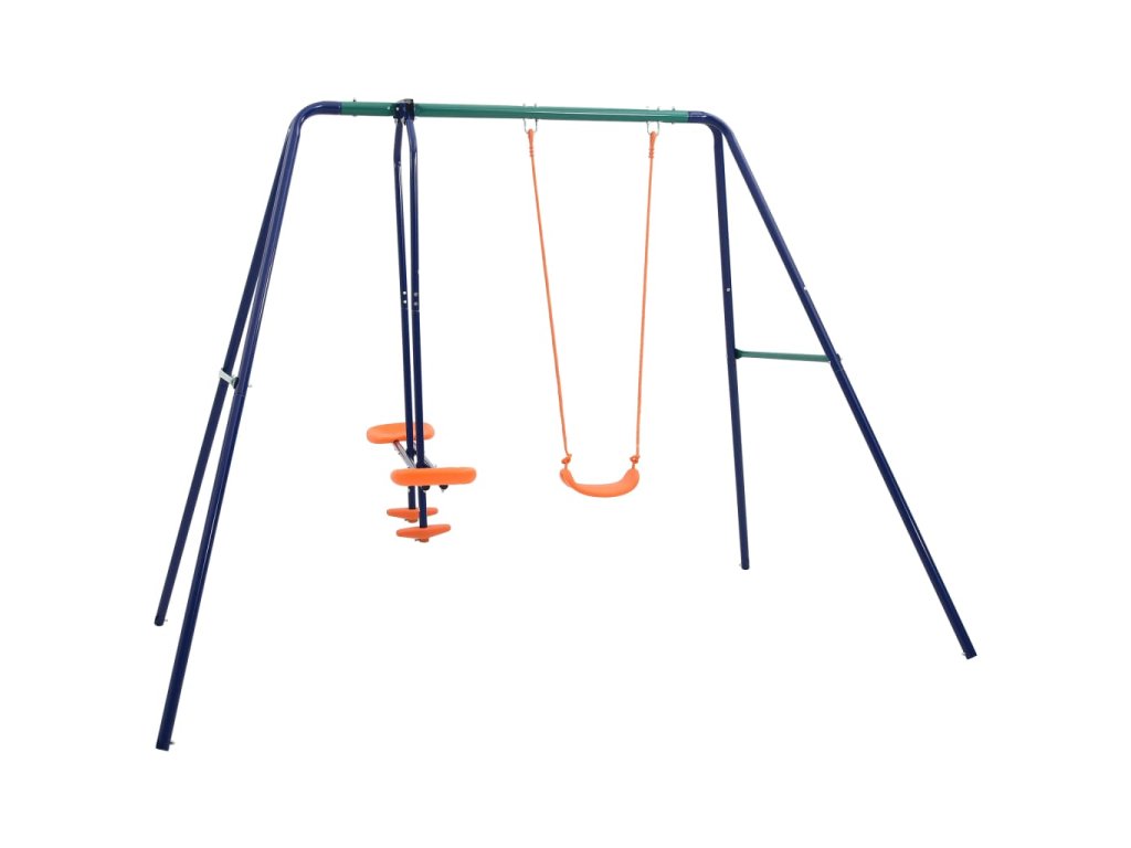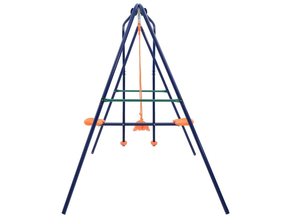 Sada hojdačiek sa skladá z pevného oceľového rámu v tvare písmena A s jednomiestnou hojdačkou a jednou dvojitou hojdačkou. Dvojitá hojdačka so sedadlami je vhodná pre dve deti súčasne. Vďaka pevnému oceľovému rámu a plastovým sedadlám je sada veľmi trvácna a odolná voči poveternostným vplyvom. Jednoducho sa inštaluje. Všetky prvky sú pevne pripevnené k priečnemu nosníku rámu v tvare písmena A pomocou pevných konzol, skrutiek, hákov a lán.