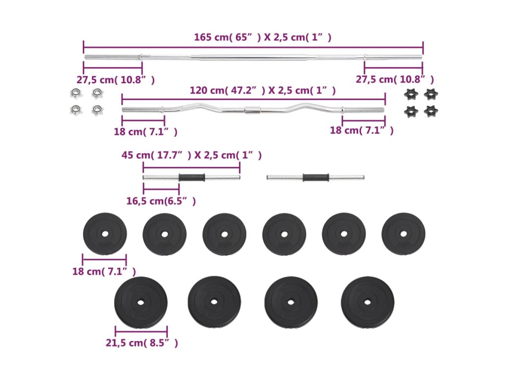 - Veľkosť obojručnej činky (rovnej): 2,5 x 165 cm (priemer x D)