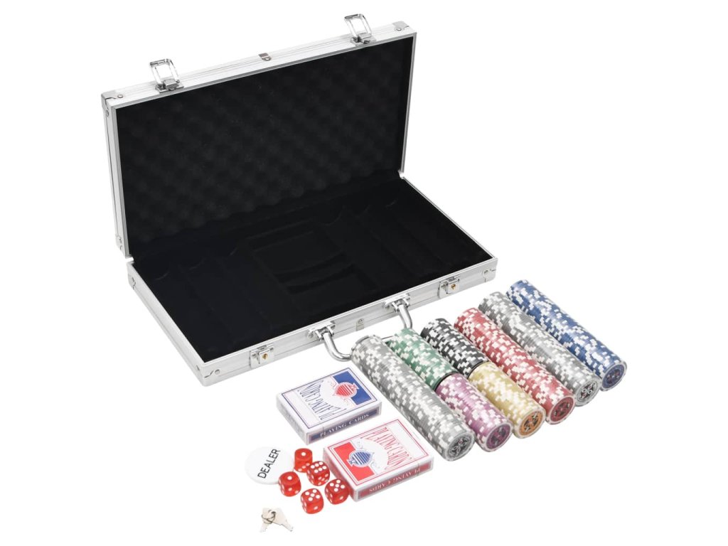 - Profesionálna pokerová súprava: Táto súprava obsahuje 5 kociek, 2 balíčky kariet, 1 tlačidlo krupiéra a 300 laserových žetónov.