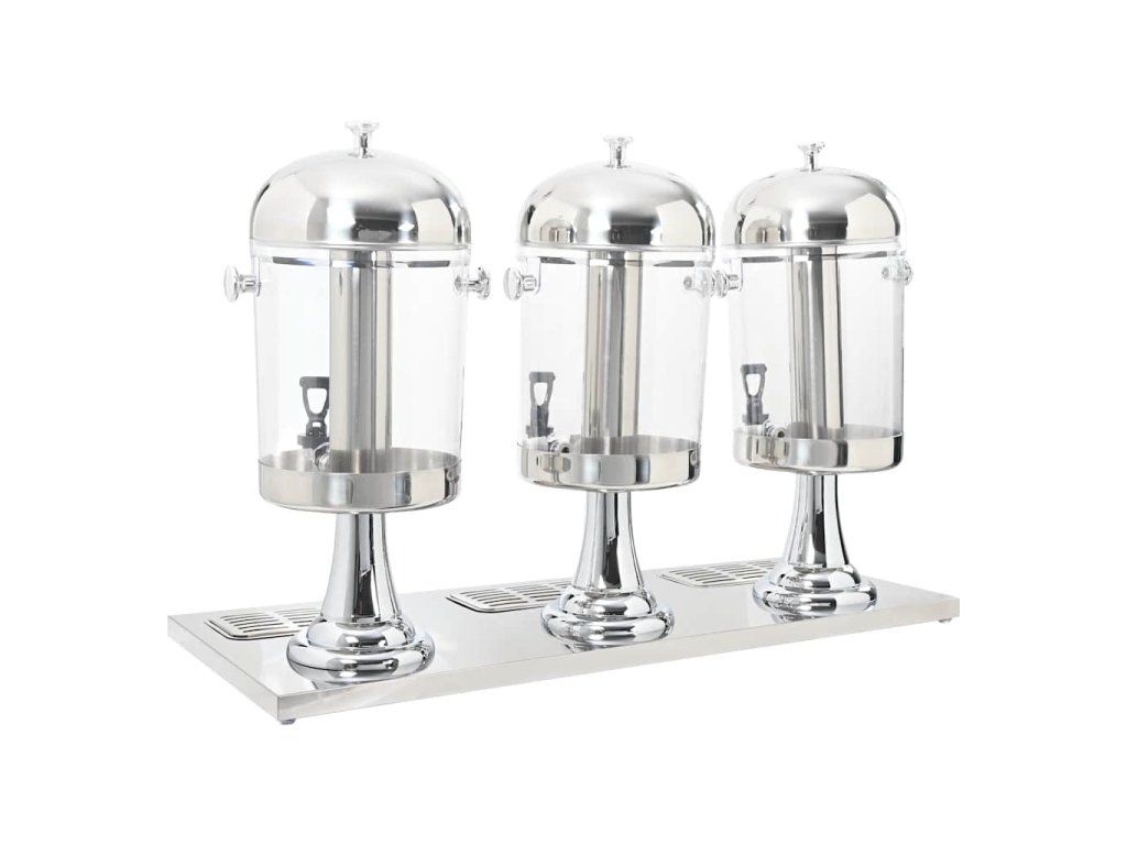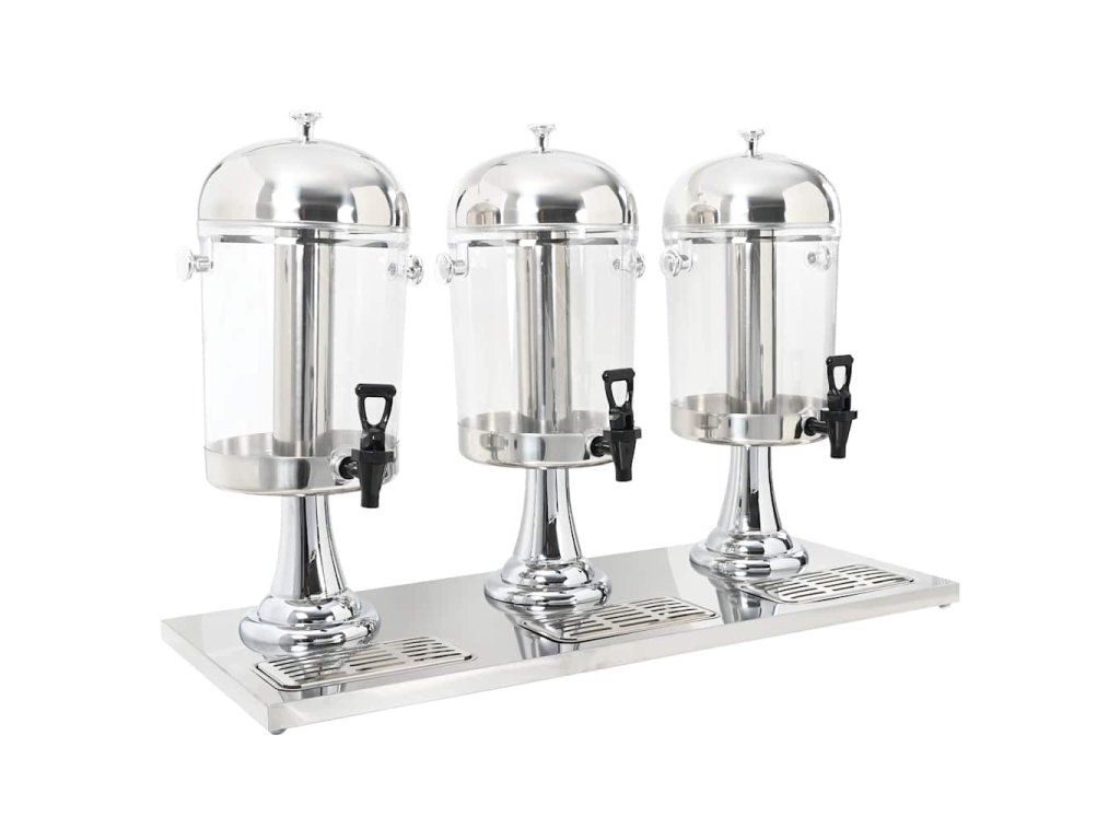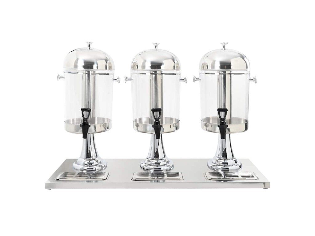 Trojitý zásobník na nápoje má rámy z nehrdzavejúcej ocele a priehľadné plastové nádoby. Je trvácny a ľahko sa čistí.