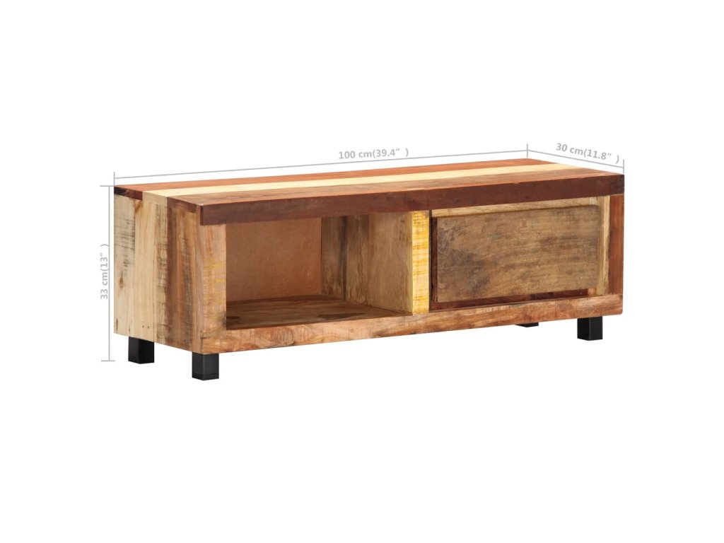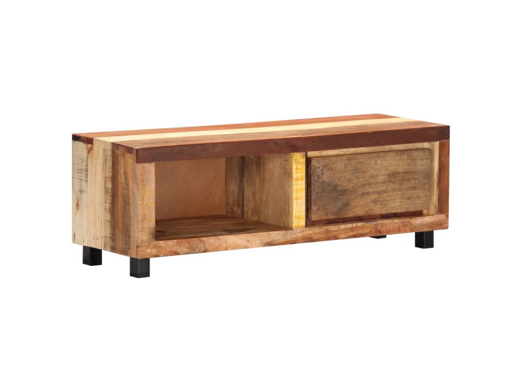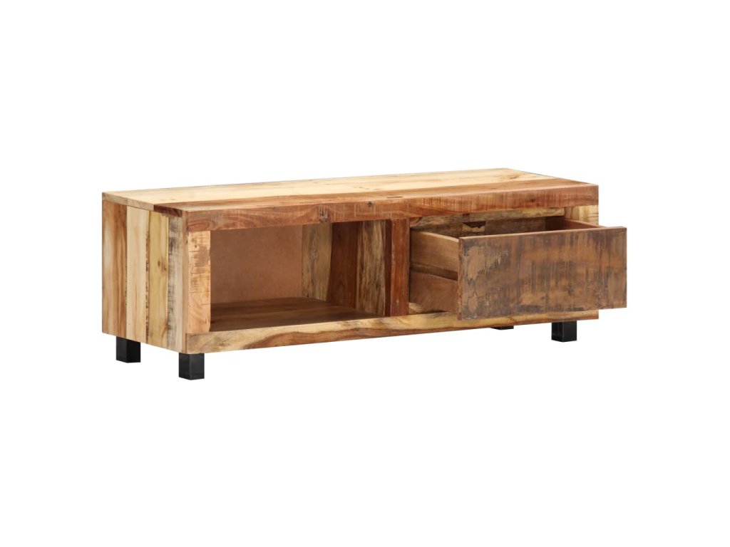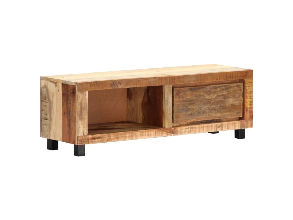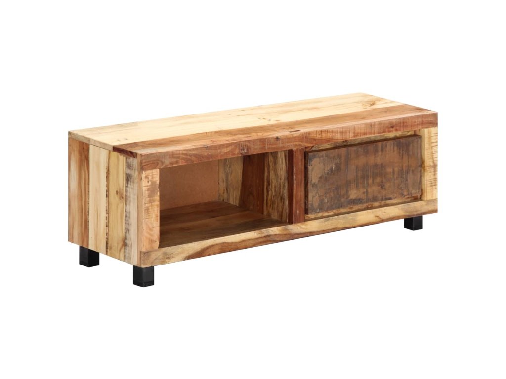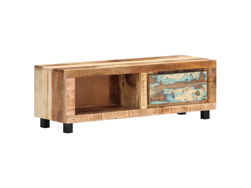 Stolík na TV je vyrobený z recyklovaného masívu, vďaka čomu je veľmi stabilný a trvácny. Recyklované drevo má podobné vlastnosti ako iné druhy dreva, napríklad tíkové, mangové, akáciové drevo a podobne. Je staré, zvetrané a usušené, a preto sa nezmršťuje ani neohýba. Každý krok výrobného procesu sa vykonáva s najväčšou starostlivosťou, či už je to leštenie alebo lakovanie. Spevnený železný rám skrinke prináša potrebnú stabilitu. Skrinka má 1 zásuvku a 1 priečinok na odkladanie drobností a multimediálnych zariadení. TV stolík sa jednoducho montuje.