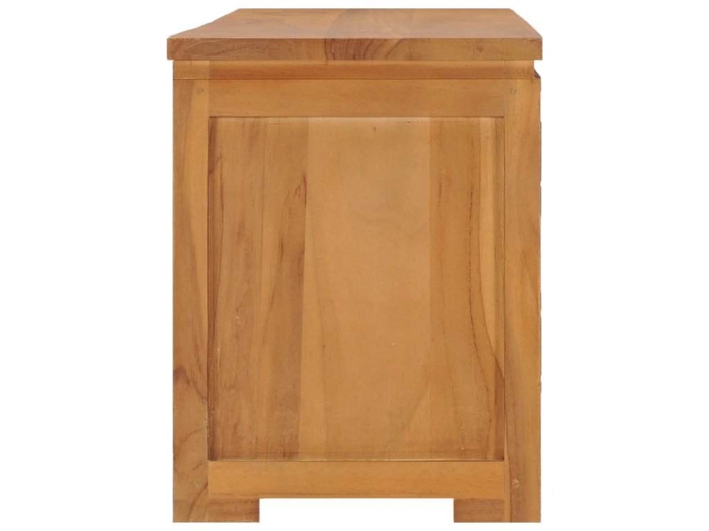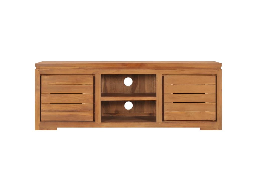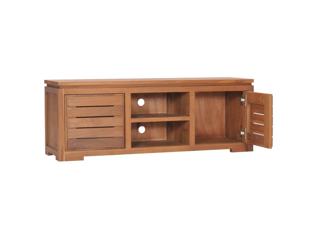 TV stolík bol vyrobený z mimoriadne trvácneho tvrdého teakového dreva, ktoré bolo umelo vysušené v sušiarni a jeho povrch bol následne jemne obrúsený, aby získal hladký vzhľad. Teakové drevo sa vyznačuje výnimočnou pevnosťou, a tak predstavuje jeden z najvhodnejších materiálov na výrobu záhradného nábytku spomedzi všetkých ostatných druhov dreva. Drevená TV skrinka má stabilnú hornú časť na umiestnenie televízie, kvetináčov a iných dekoratívnych predmetov. Má dvoje dvierka a dve priehradky, ktoré poskytujú dostatok priestoru na uloženie vašich DVD, časopisov a iných rôznych predmetov.