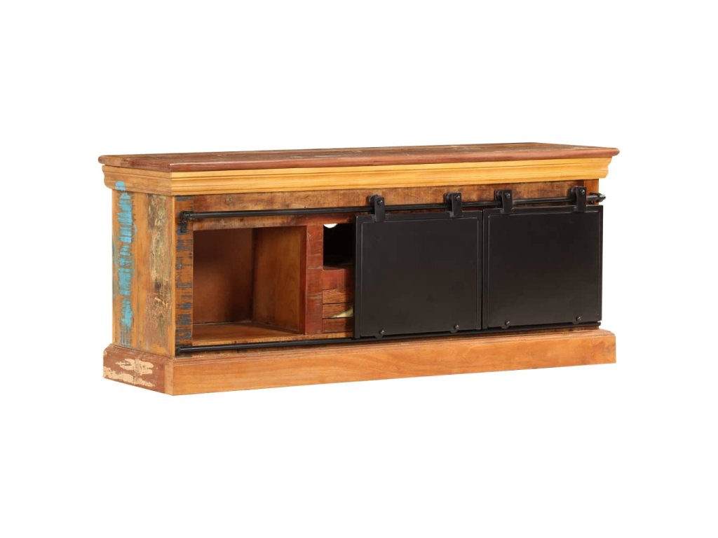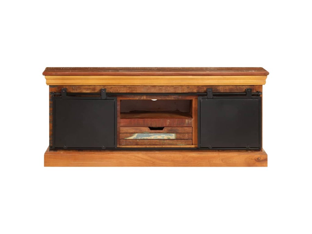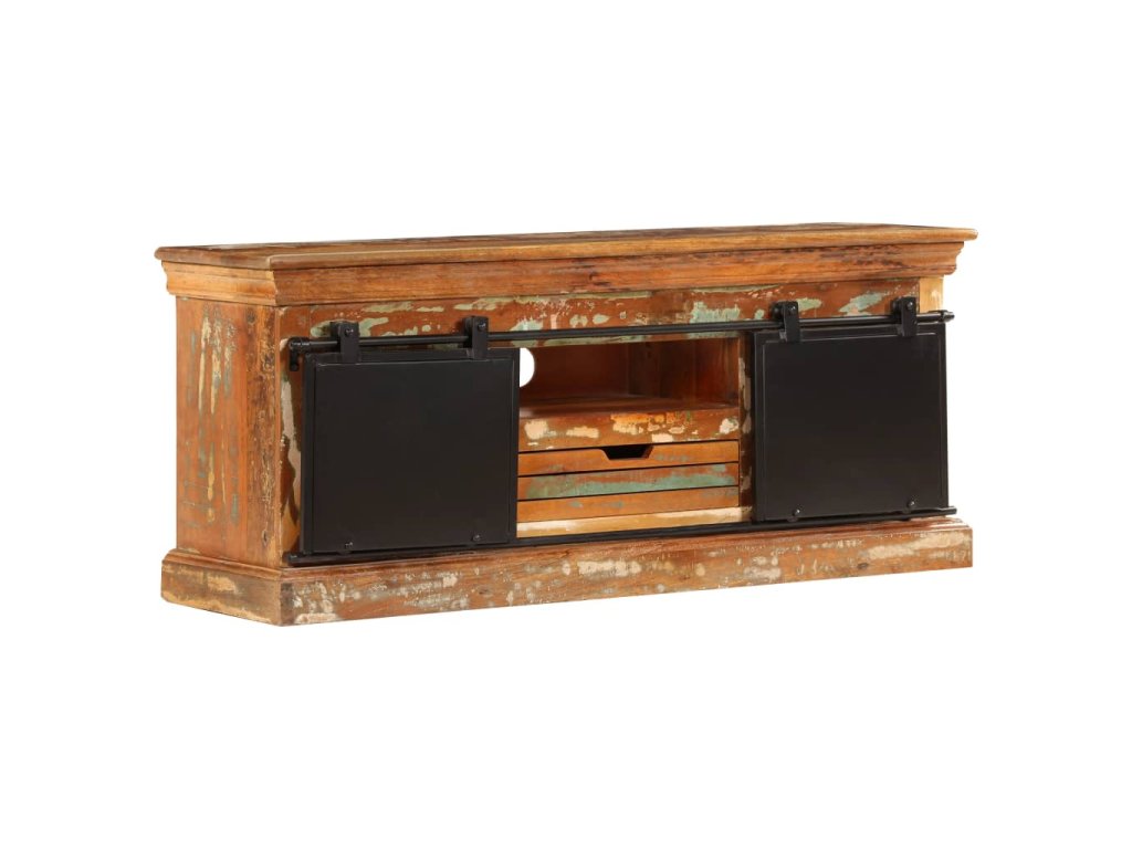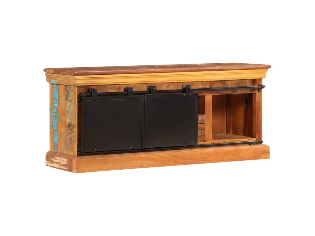 Skrinka na Hi-Fi vežu je vyrobená z recyklovaného masívu, ktorý pochádza z trámov, podláh a nosníkov zo starých zbúraných stavieb a pozostáva z rôznych typov dreva, ako napríklad borovicového, tíkového, bukového, dubového, cédrového, mangového či akáciového dreva. Recyklované drevo sa preto vyznačuje vlastnosťami týchto typov dreva. Recyklované drevo je staré, zvetrané a usušené, a preto sa nezmršťuje ani neohýba. Nízka skrinka je kompletne ručne vyrobená a vďaka krásnej textúre dreva je každý kus nábytku jedinečný a trochu odlišný od ostatných. Kovové dvierka umocňujú industriálny štýl skrinky.