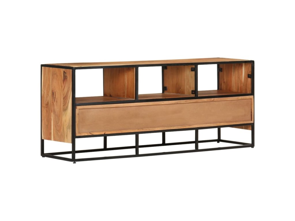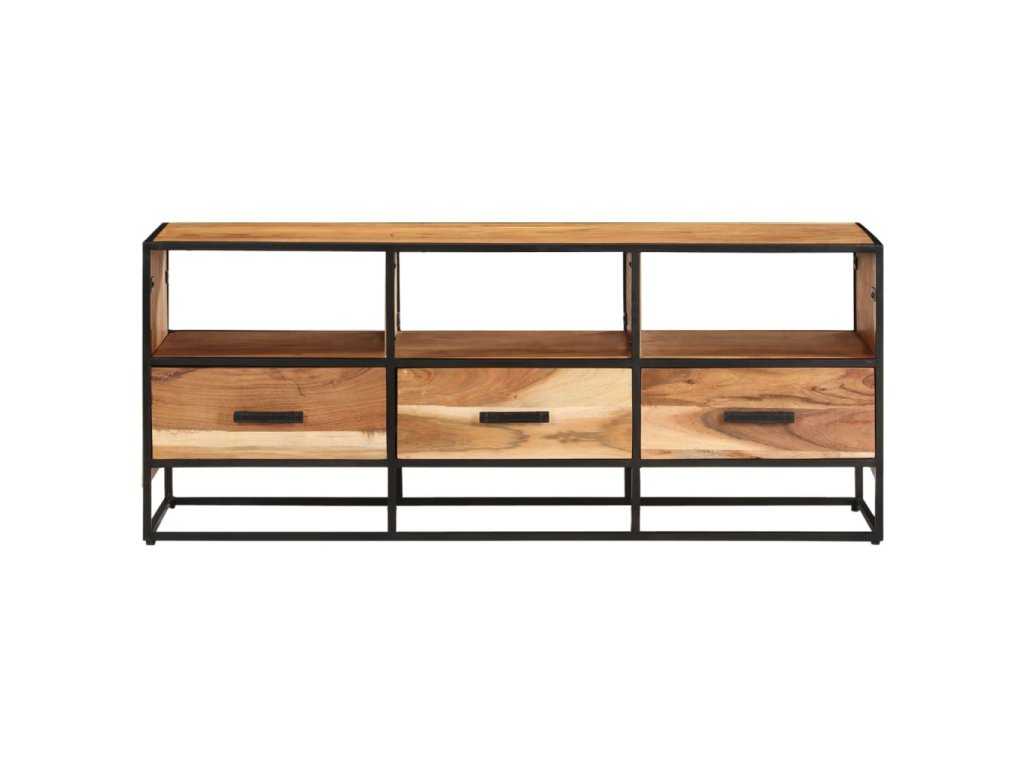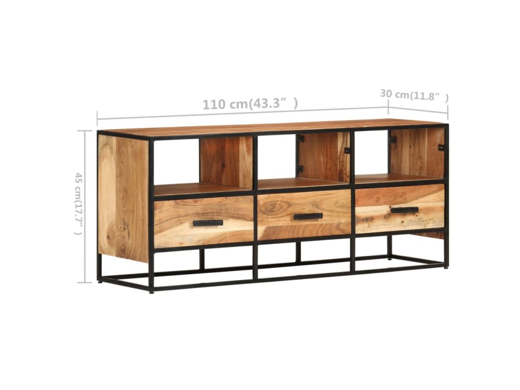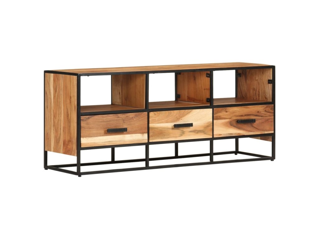 Táto komoda je vybavená 3 zásuvkami a 3 policami, a poskytuje dostatok priestoru na uloženie časopisov, kníh a rôznych iných drobných predmetov na dosah ruky. Táto HiFi skrinka je vyrobená z masívneho akáciového dreva s prírodnou povrchovou úpravou a vyniká originálnym vzhľadom. Vďaka vynikajúcemu remeselnému spracovaniu a krásnej kresbe akáciového dreva je každý kus nábytku jedinečný a trochu odlišný od ostatných kusov. Práškovaný železný rám navyše prispieva k stabilnej a pevnej konštrukcii, a dodáva stereo skrinke aj industriálny štýl.