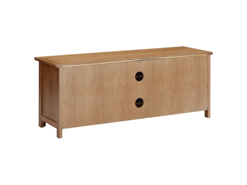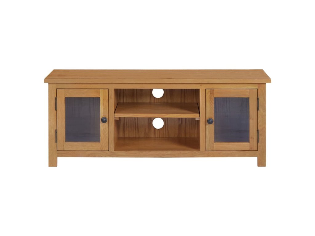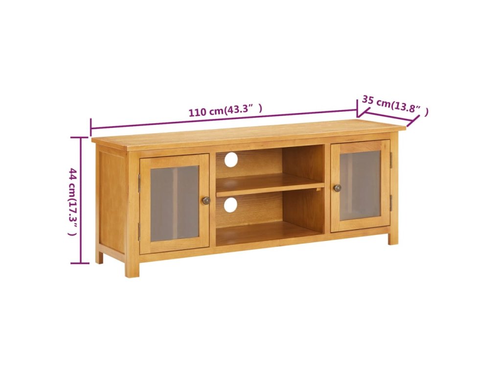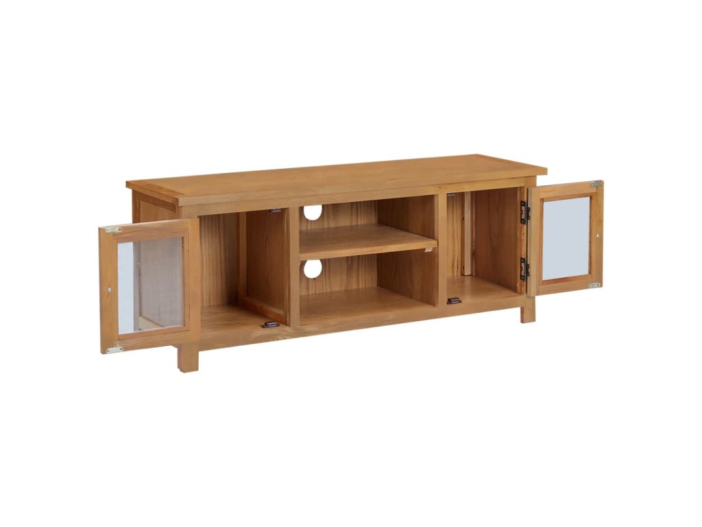 Tento robustný TV stolík je vyrobený z masívneho dubového dreva a MDF, vďaka čomu je odolný. Pevná stolová doska poskytuje stabilný a bezpečný povrch, na ktorý môžete umiestniť televízor, košík s ovocím, vázu alebo iné dekoratívne predmety. Táto TV skrinka má dve dvierka a dve otvorené priehradky, ktoré poskytujú dostatok priestoru na uloženie vašich multimediálnych zariadení, kníh a rôznych predmetov.