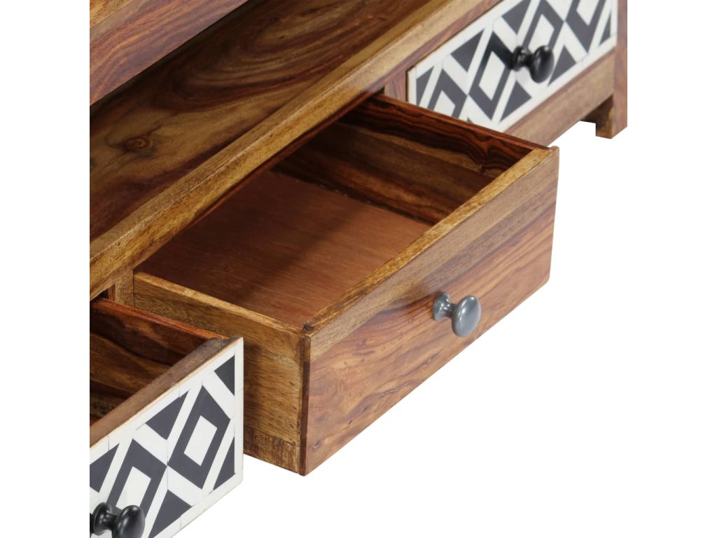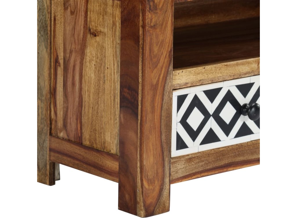 Táto TV skrinka vo vintage štýle je vyrobená z dreveného masívu sheesham a predstavuje nadčasový doplnok do domácnosti. Sheesham je drevo tropického listnatého stromu, ktoré sa vyznačuje nádhernou textúrou a ktorému sa niekedy hovorí aj palisander alebo ružové drevo. Každý krok výrobného procesu sa vykonáva s maximálnou starostlivosťou, či už ide o leštenie, natieranie alebo lakovanie. Skrinka má 3 zásuvky na odkladanie rôznych drobností a otvorenú priehradku na multimediálne zariadenia, herné konzoly a časopisy.