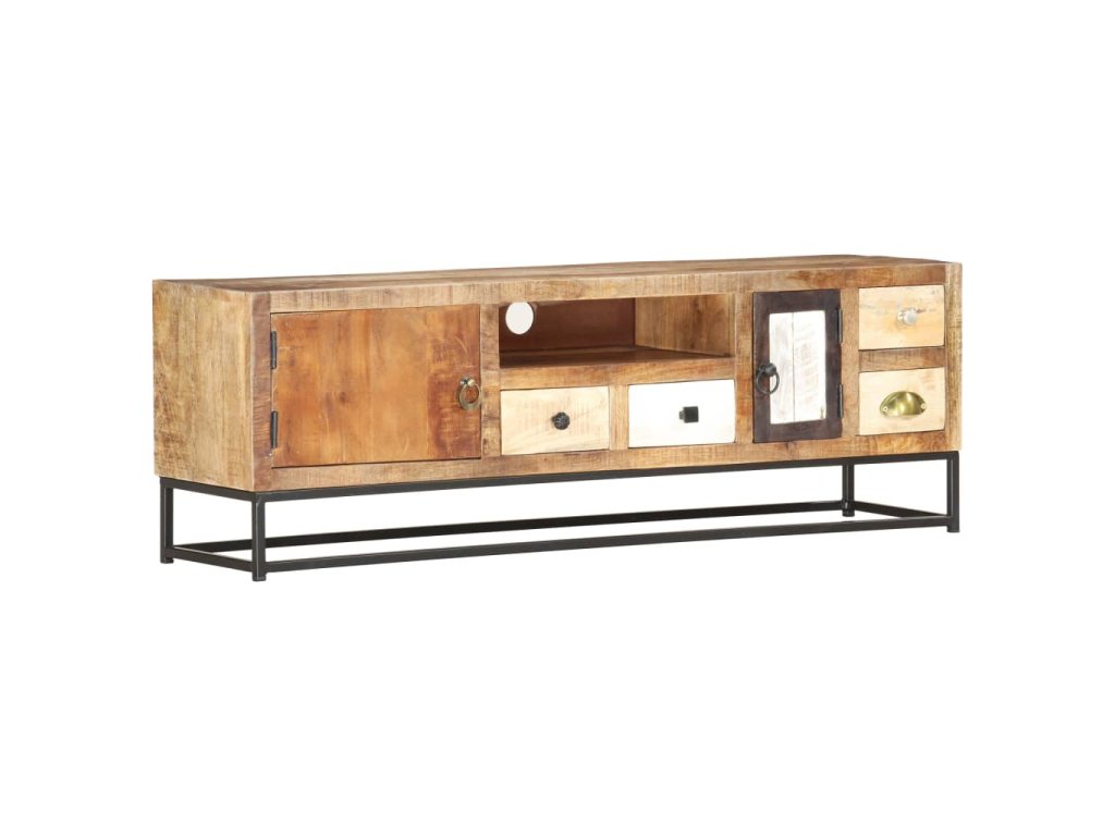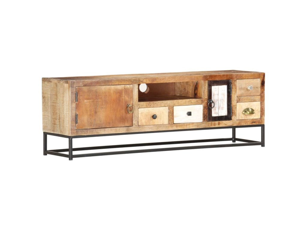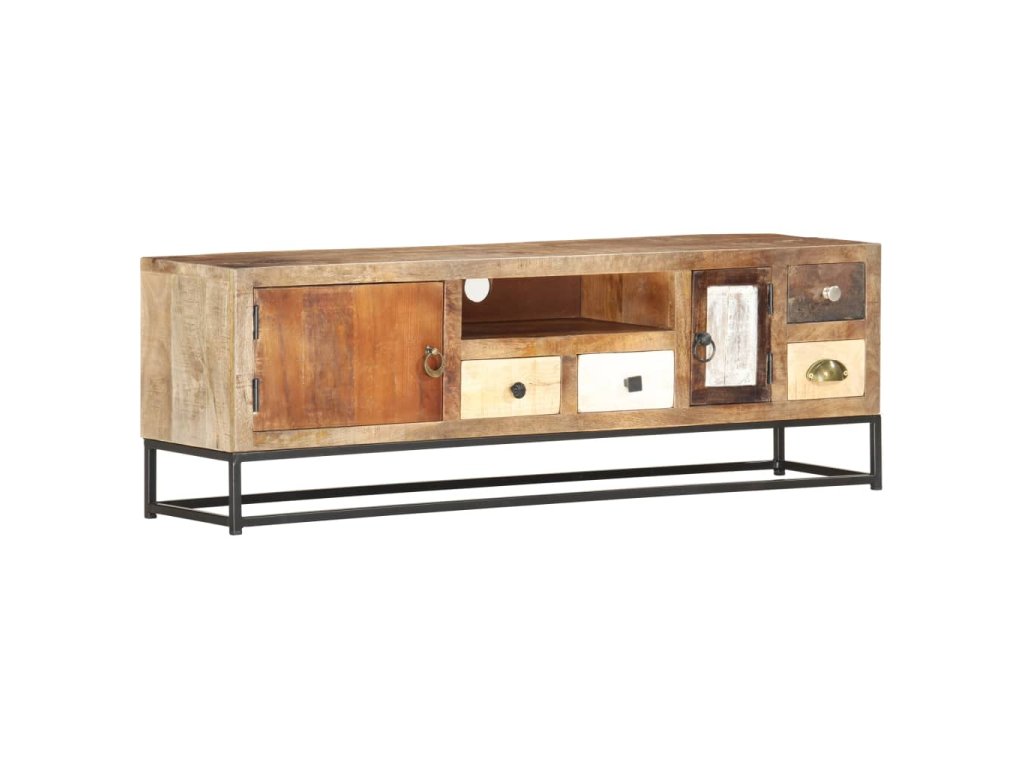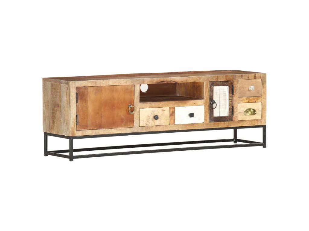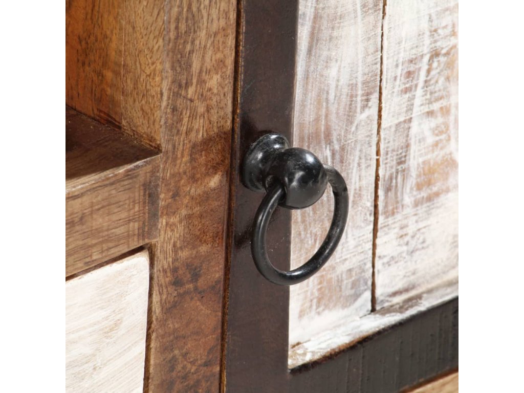 Skrinka na Hi-Fi vežu je vyrobená z recyklovaného masívu, ktorý pochádza z trámov, podláh a nosníkov zo starých zbúraných stavieb a pozostáva z rôznych typov dreva, ako napríklad borovicového, tíkového, bukového, dubového, cédrového, mangového či akáciového dreva. Recyklované drevo sa preto vyznačuje vlastnosťami týchto typov dreva. Recyklované drevo je staré, zvetrané a usušené, a preto sa nezmršťuje ani neohýba. Nízka skrinka je kompletne ručne vyrobená a vďaka zaujímavej textúre dreva je každý kus nábytku jedinečný a trochu odlišný od ostatných. Oceľový rám s práškovou porvchovou úpravou umocňuje industriálny vzhľad skrinky. Komoda s 2 dvierkami, 4 zásuvkami a 1 priečinkom poskytuje množstvo úložného priestoru na multimediálne zariadenia, knihy či rôzne iné predmety.