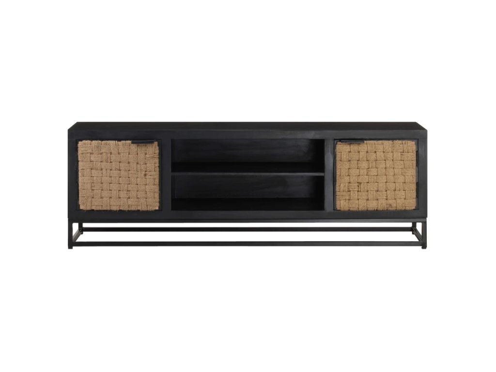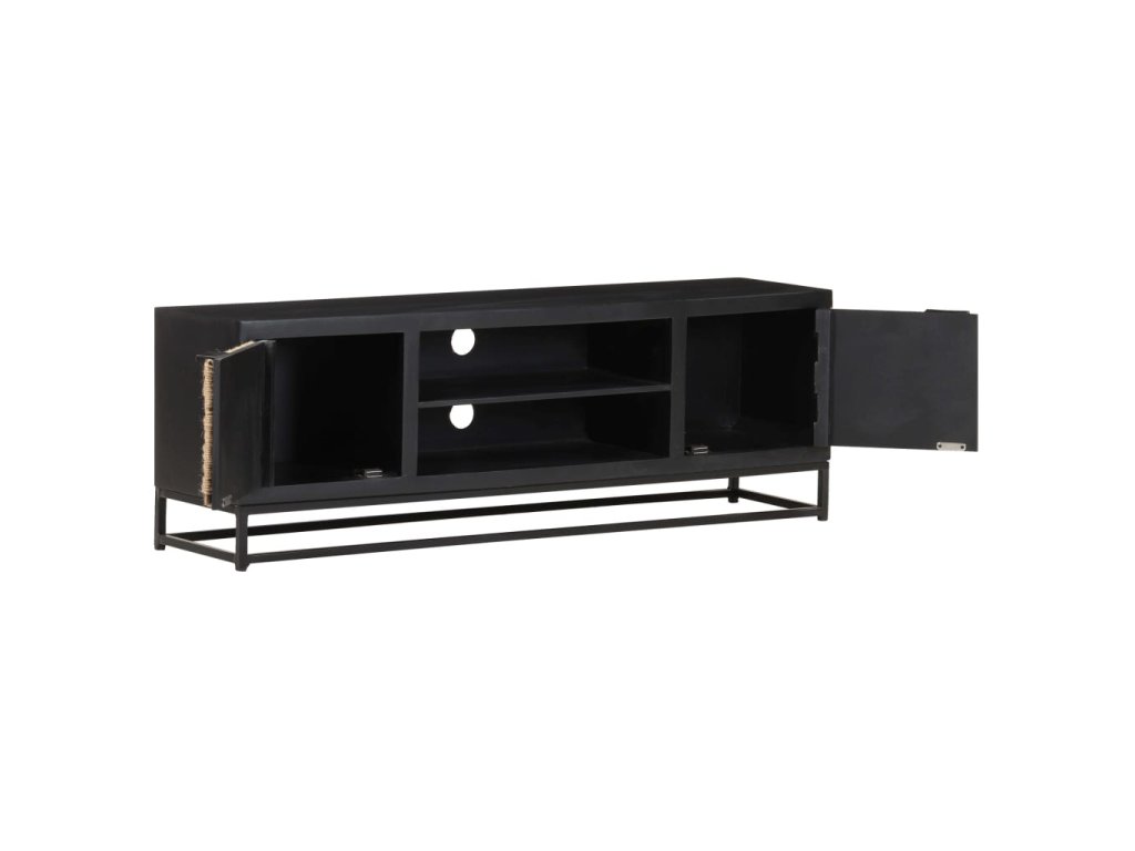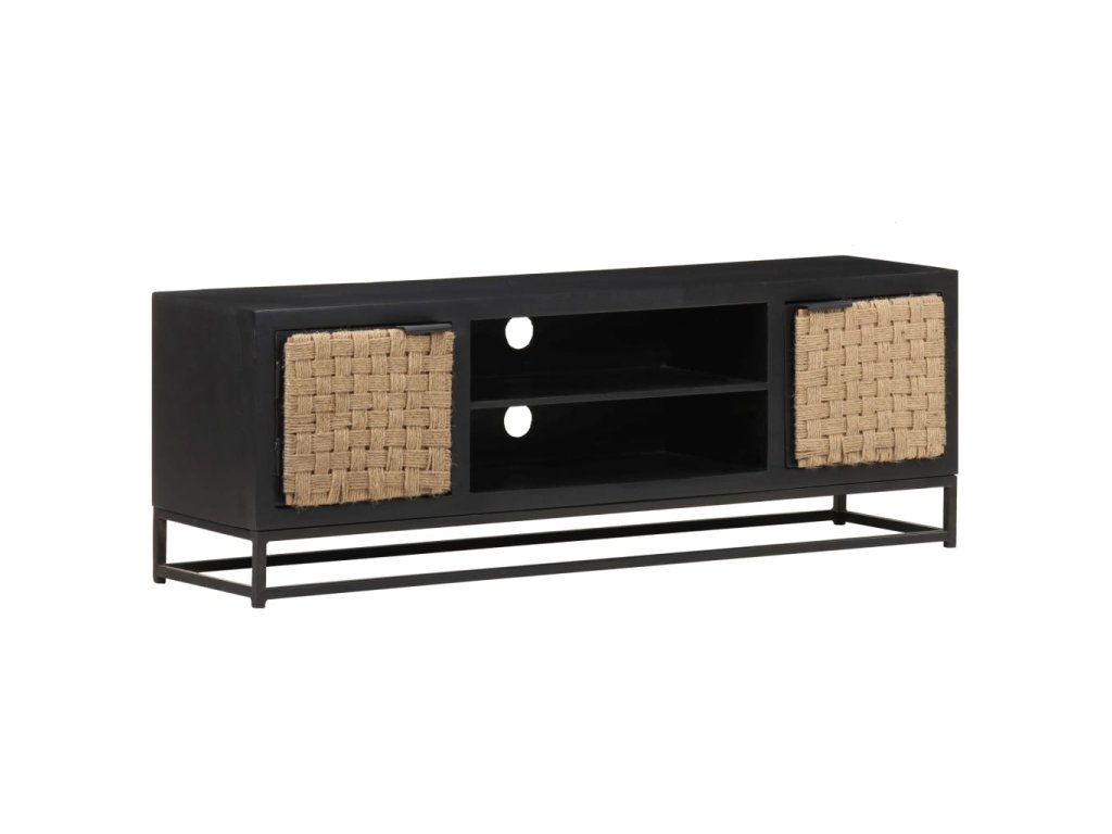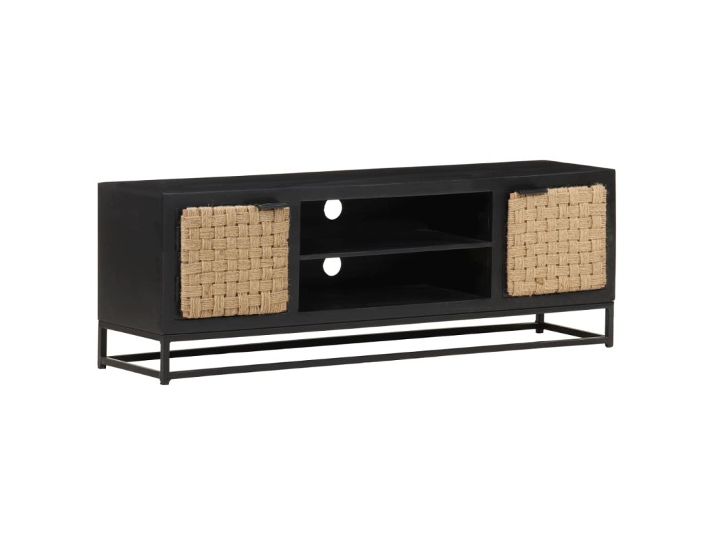 Stereo skrinka je vyrobená z masívneho mangovníkového dreva, tropického tvrdého dreva s pevnosťou uniesť aj vyššiu hmotnosť. Odoláva aj opotrebovaniu časom, takže je stabilná a odolná. Dvierka sú vyrobené z prírodnej juty a železná základňa tiež dodáva extra stabilitu. TV skrinka má aj dve dvierka a dve priehradky, ktoré poskytujú dostatok úložného priestoru.