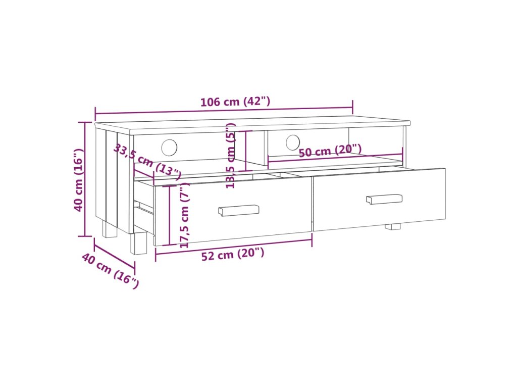 TV stolík je vyrobený z masívneho borovicového dreva, vďaka čomu je stabilný a pevný. Televízna jednotka má 2 hladké posuvné zásuvky a 2 priehradky, ktoré poskytujú dostatok úložného priestoru na uloženie vašich multimediálnych zariadení, kníh a iných predmetov dobre organizovaných a na dosah ruky. Pevná stolová doska je ideálna na vystavenie dekoratívnych predmetov, fotorámikov a rastlín v črepníkoch. Vďaka otvoru na zadnej strane môžete skryť káble za skrinku, aby ste ich nemali na očiach.