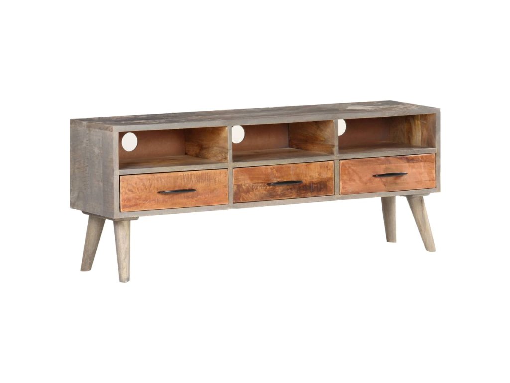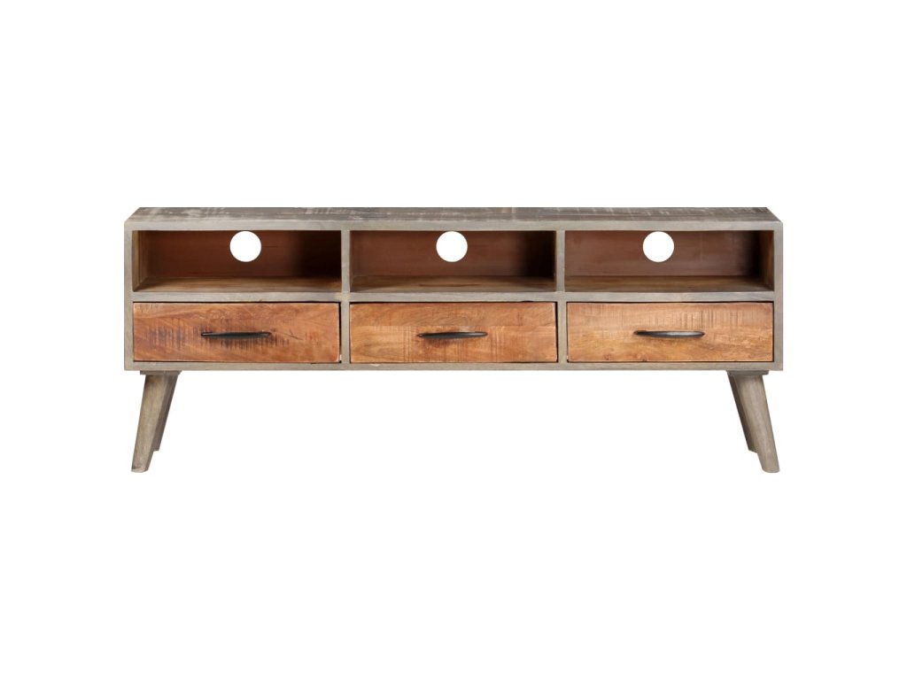 Tento TV stolík je vyrobený z masívne mangovníkového dreva, tropického tvrdého dreva. Toto drevo sa môže pochváliť nielen pevnosťou, ktorá unesie veľkú hmotnosť, ale aj odolnosťou voči opotrebovaniu. Vďaka vynikajúcemu remeselnému spracovaniu a nádhernej drevenej štruktúre sa každý kúsok mierne líši od iných kusov. Táto stereo skrinka má 3 priehradky a 3 zásuvky, ktoré poskytujú dostatok úložného priestoru na usporiadanie DVD, multimediálnych zariadení, kníh a drobných základných predmetov.