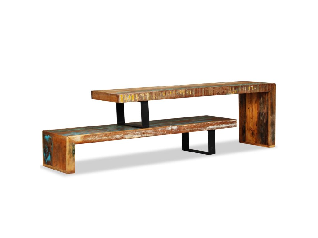 TV stolík je ručne vyrobený z recyklovaného masívu, ktorý je stabilný, trvácny a krásny a má podobné vlastnosti ako napríklad tíkové, mangové či akáciové drevo a podobne. Každý krok výrobného procesu sa vykonáva s maximálnou starostlivosťou, či už je to leštenie alebo lakovanie. Vďaka remeselnému opracovaniu a krásnej textúre dreva je každý kus nábytku jedinečný a trochu odlišný od ostatných. Skrinka na TV s 2 poličkami navyše poskytujú množstvo priestoru na odkladanie multimediálnych zariadení, mediálnych nosičov či iných predmetov, ktoré si chcete vystaviť alebo ktoré by ste chceli mať vždy poruke. Vrchná časť TV skrinky sa dá zložiť dolu alebo ľubovoľne umiestniť tak, aby bol stolík širší alebo užší.