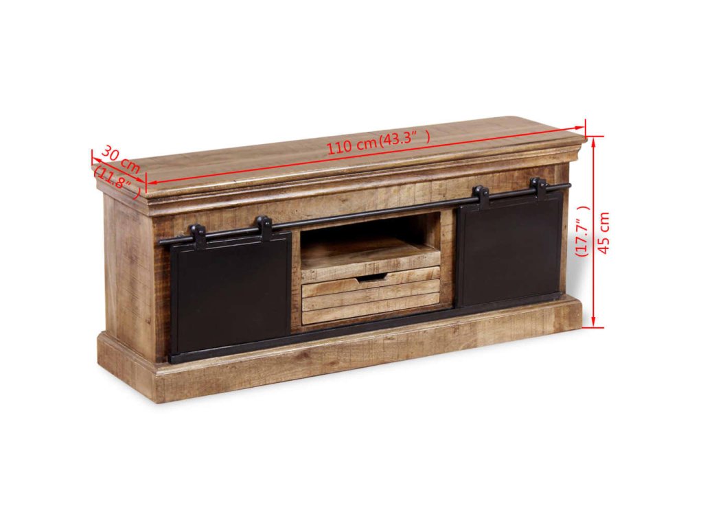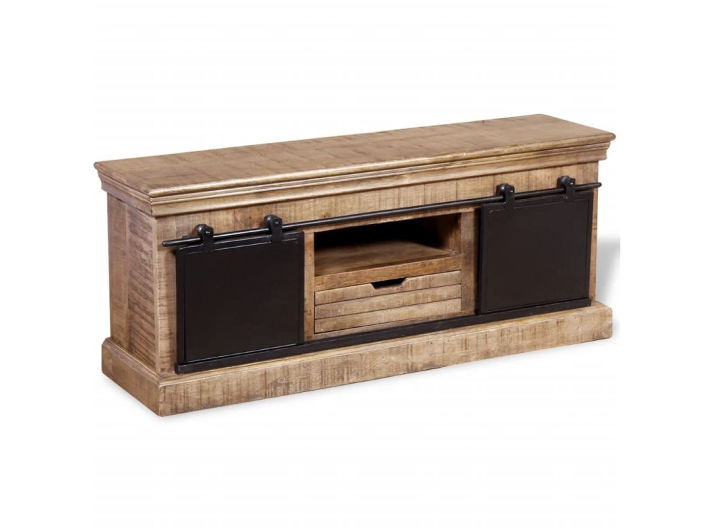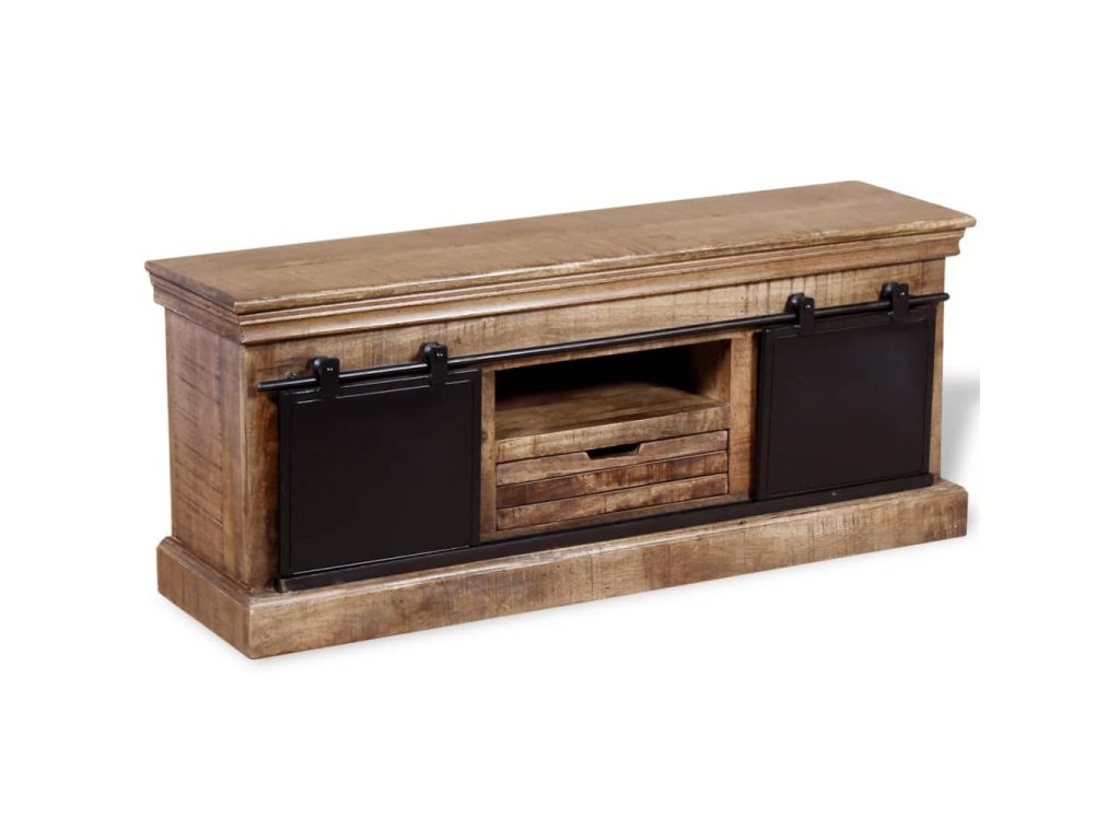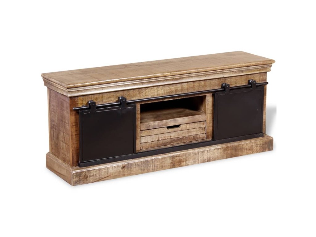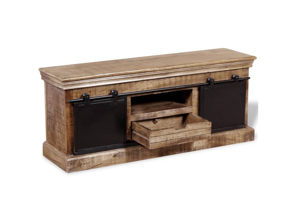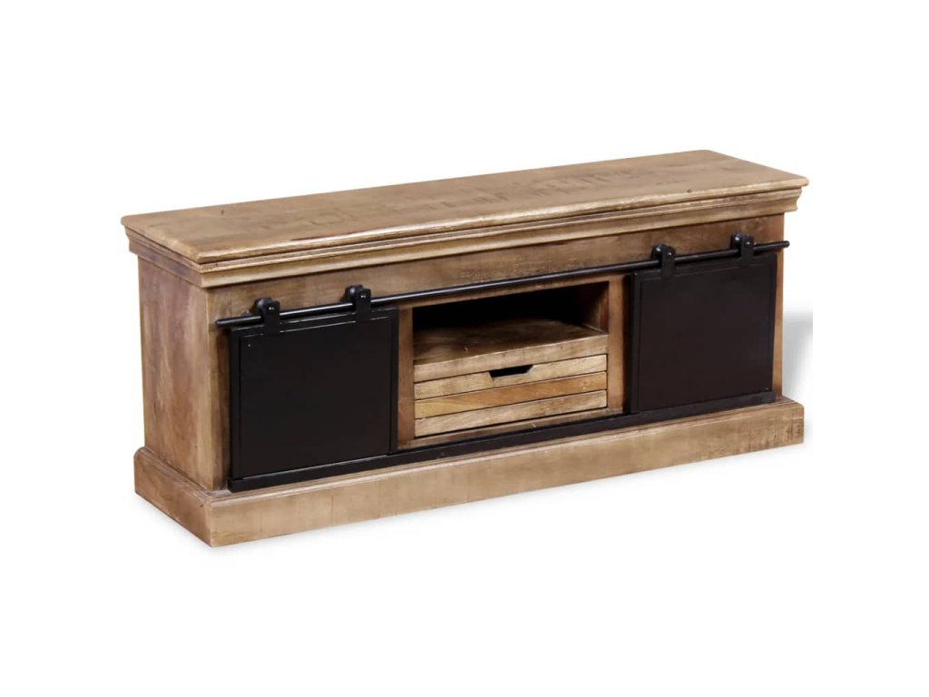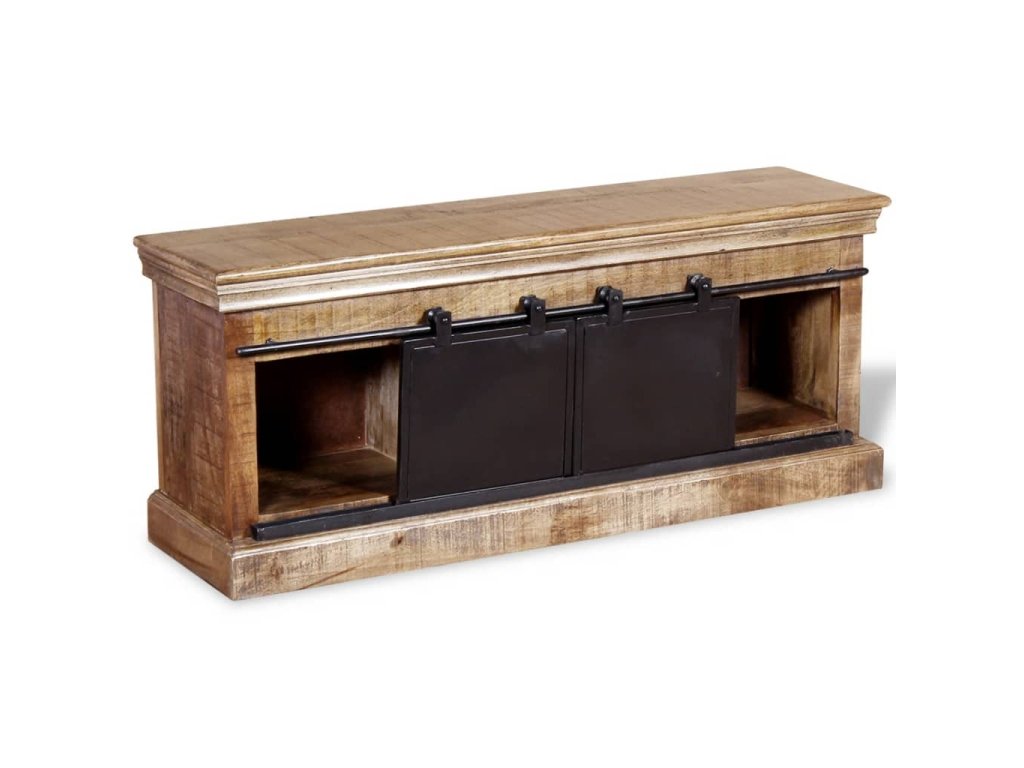Tento TV stolík je vyrobený z masívneho mangového dreva, čo znamená, že je pevný, stabilný a odolný. Do poličiek môžete uložiť multimediálne zariadenia, časopisy, atď. Stolík má dve priehradky, ktoré majú posuvné dvierka a poskytujú dostatok miesta na usporiadanie CD diskov, časopisov. Železné posuvné dvierka prispievajú k robustnosti a vďaka ich dizajnu je tento stolík úžasný a jedinečný. Viditeľná štruktúra robí každý kus nábytku jedinečným, pretože sa jednotlivé kusy od seba odlišujú.