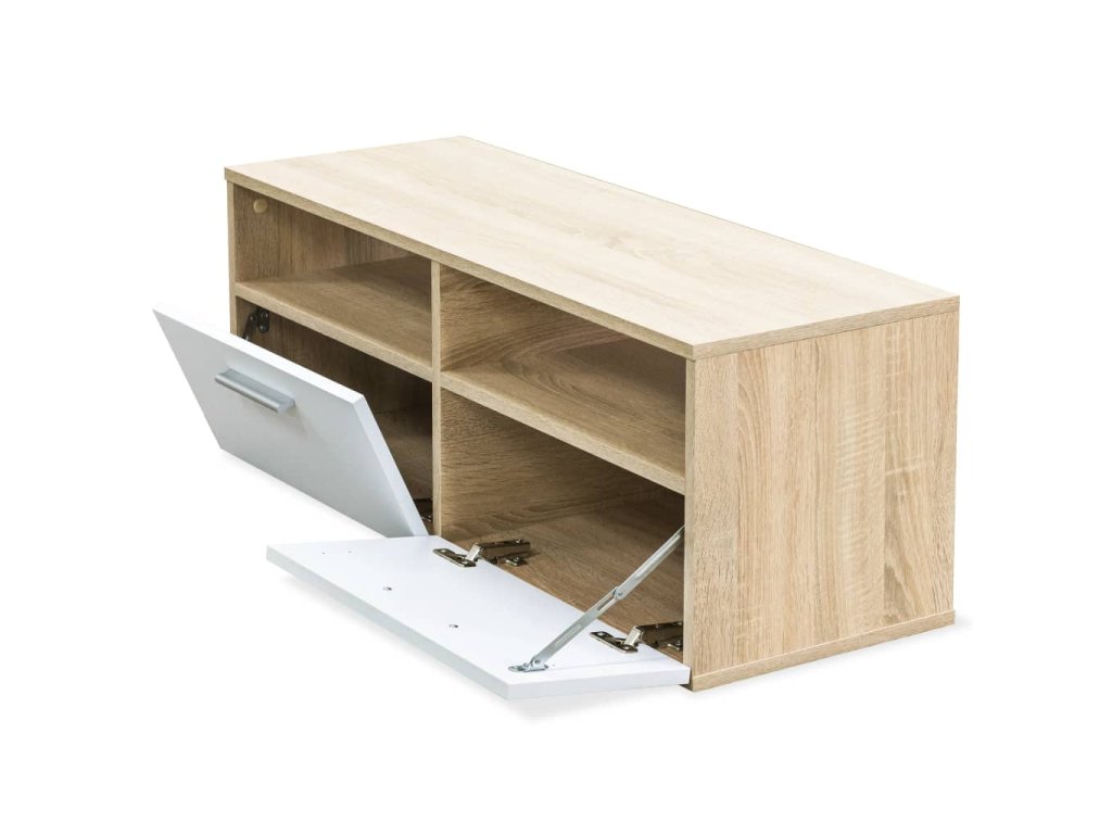 HiFi skrinka je vyrobená z drevotriesky s PVC hranami a je stabilná a trvácna. Má dve otvorené poličky a dve skrinky s dvierkami, ktoré sa vyklápajú smerom nadol a poskytujú dostatok priestoru na uloženie vášho DVD prehrávača, hernej konzoly, digitálneho prijímača alebo nosičov médií. Táto TV skrinka s čistým dizajnom bude skvelým doplnkom vo vašej spálni alebo obývacej izbe.