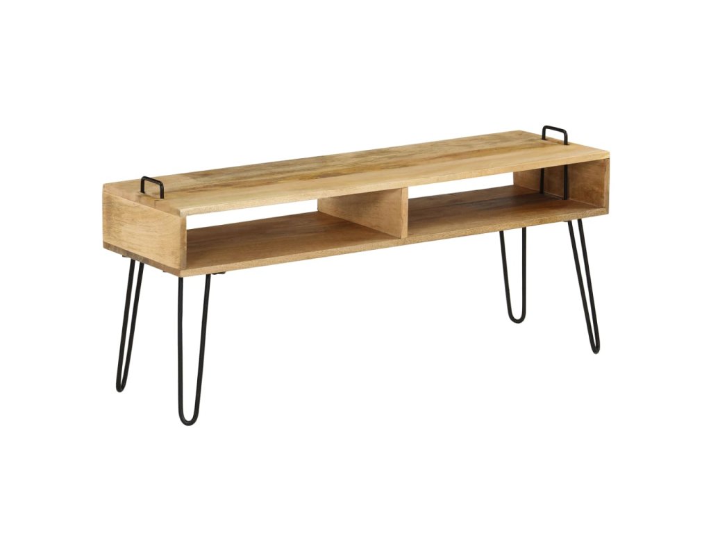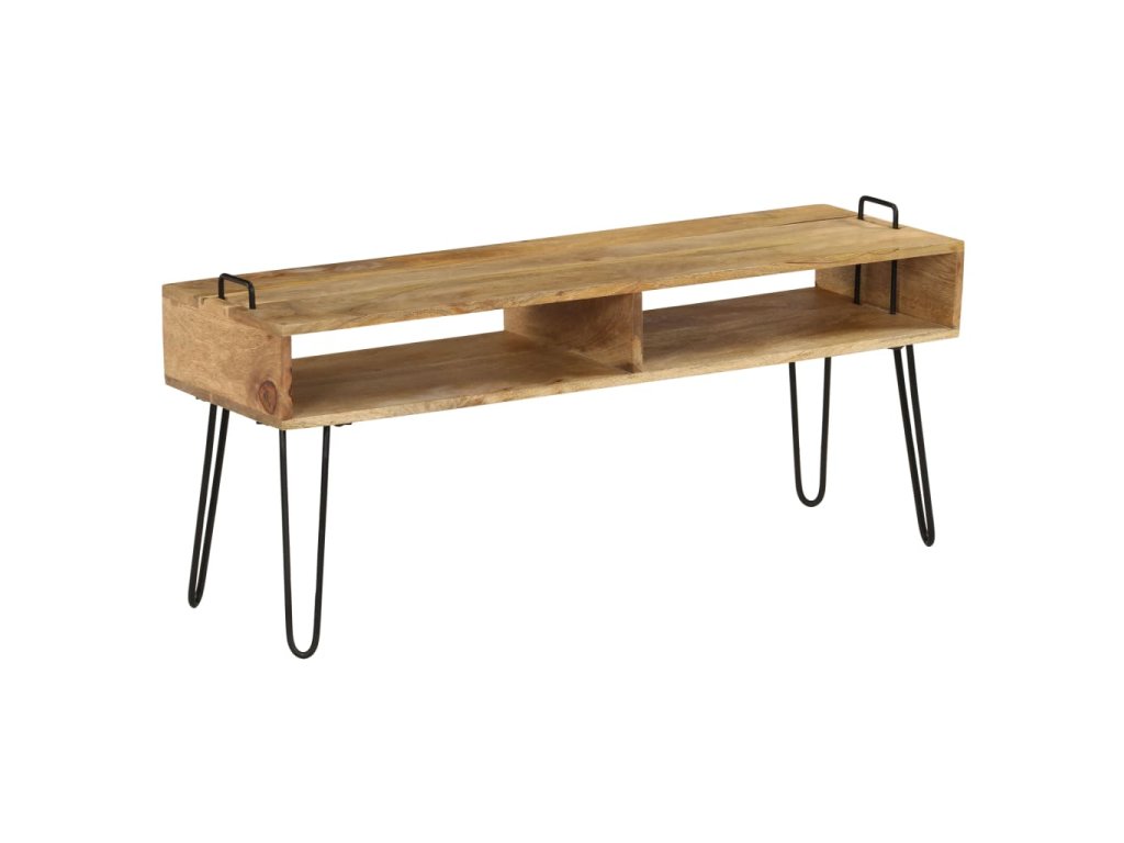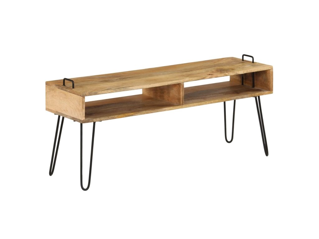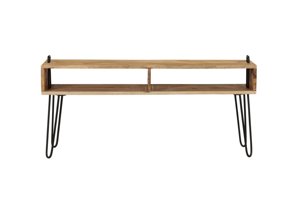 Táto HiFi skrinka, vyrobená z masívneho mangovníkového dreva a pevných oceľových rámov, je veľmi stabilná a odolná. Vrchná doska je ideálna nielen na umiestnenie televízora alebo stereo systémov, ale aj dekoratívnych predmetov, ako sú vázy a rastliny v kvetináčoch. Táto skrinka poskytuje dostatok priestoru na úhľadné uskladnenie DVD prehrávačov, herných konzol, streamovacích zariadení, nosičov médií, atď. Oceľové rámy dodávajú stolík pevnosť, ale aj priemyselnom štýle. Každý krok výrobného procesu sa vykonáva s najväčšou starostlivosťou, či už je to brúsenie, natieranie alebo lakovanie. Montáž TV stolíka je jednoduchá.