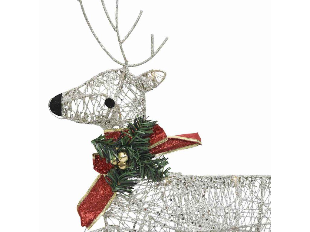 Dekorácia má kovový rám a je vytvarovaná z pletiva, a tak bude po celé sviatky výborne odolávať poveternostným vplyvom. Môžete si ju dať aj do interiéru, napríklad do obývačky, detskej izby a podobne. Je osvetlená 60 LED diódami, ktoré sú energeticky úsporné a majú dlhú životnosť. Sob a sane sú navyše ozdobené červenými mašľami.