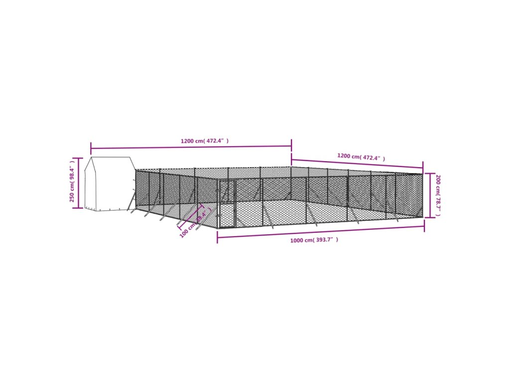 vidaXL Vonkajší koterec pre psov so strechou striebor. 12x12x2,5m oceľ