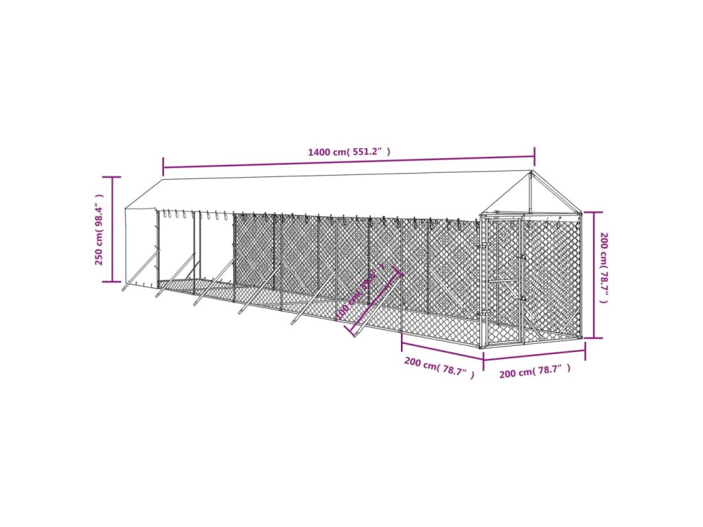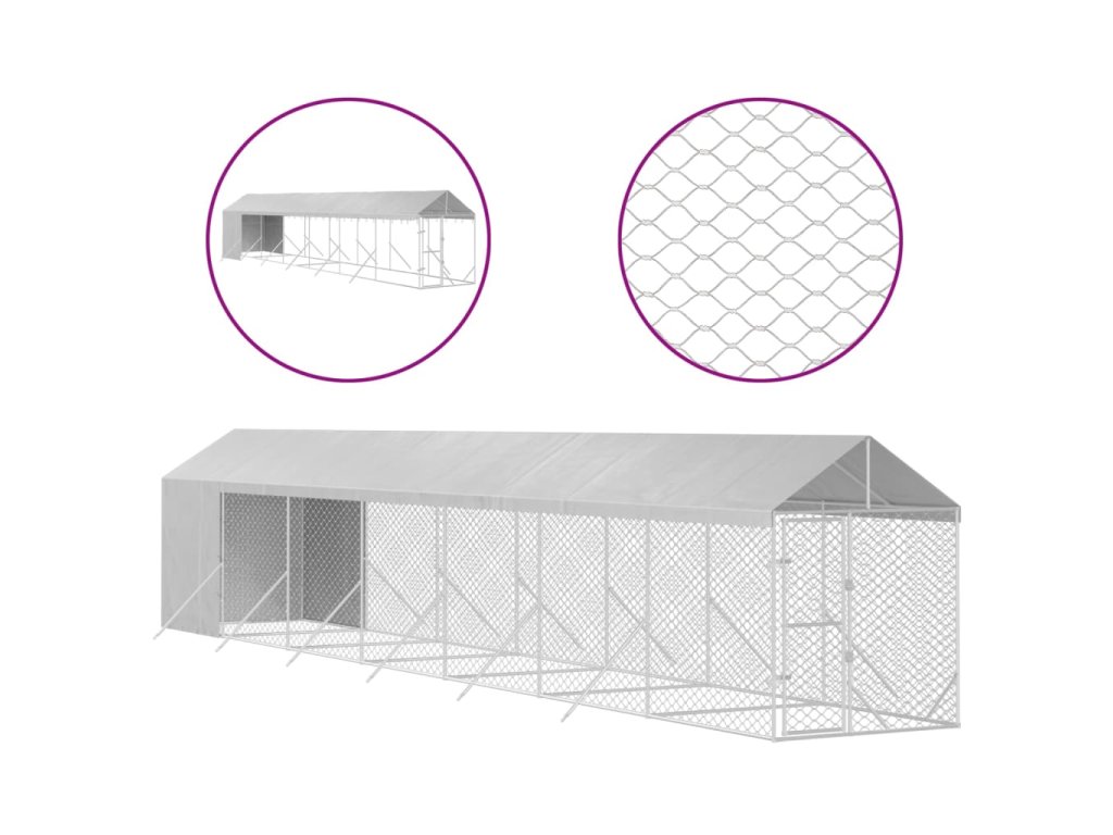 vidaXL Vonkajší koterec pre psov so strechou striebor. 2x14x2,5m oceľ