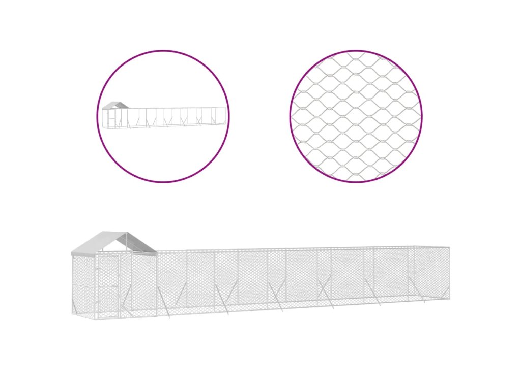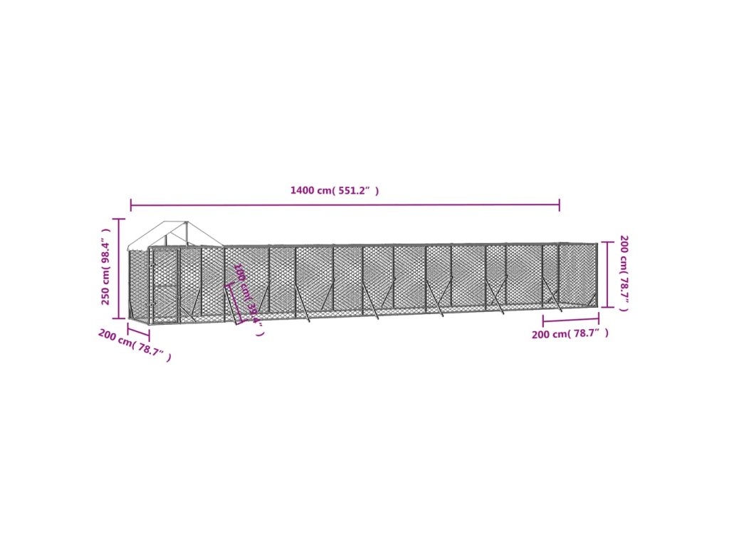 vidaXL Vonkajší koterec pre psov so strechou strieborný 14x2x2,5m oceľ