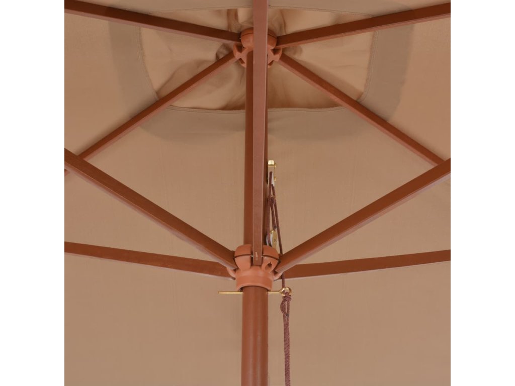 Slnečník je vyrobený z polyesteru, ktorý nevybledne a je odolný voči UV žiareniu, vďaka čomu vám poskytne optimálnu ochranu pred slnkom a ľahko sa čistí. Slnečník má tyč s priemerom 38 mm a dá sa namontovať na váš pôvodný stojan alebo do stredu stola s otvorom na slnečník. Pevná drevená tyč spolu so 6 trvácnymi rebrami zabezpečujú výbornú stabilitu a dlhú životnosť slnečníka. Tento záhradný slnečník sa dá jednoducho otvárať a zatvárať pomocou systému s jednou kladkou. Výrobok sa jednoducho montuje.