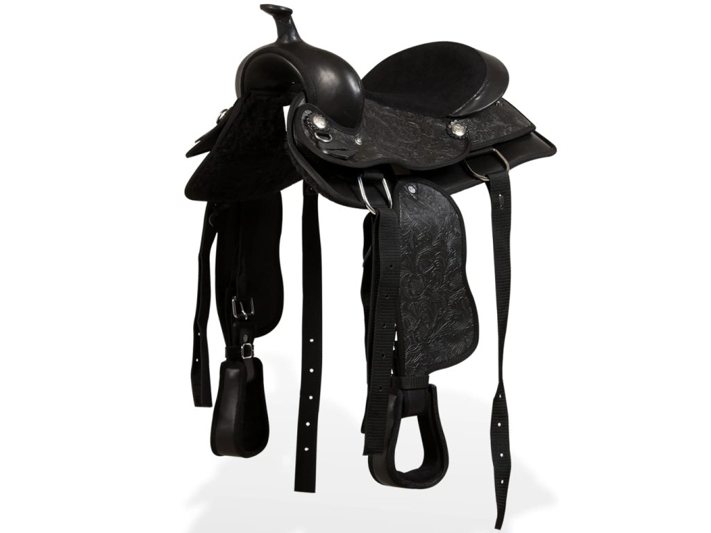 Vysokokvalitná pravá koža a umelá koža je vyzdobená kvetinovým vzorom, čo znamená, že sedlo má nielen funkčnú, ale aj dekoratívnu funkciu. Westernové sedlo je vystužené na všetkých tlakových bodoch pre vyššiu trvácnosť. Kožené strmene, strmeňový remeň a sedlová komora sú robustné a odolné. Toto sedlo je veľmi pohodlné, takže kôň aj jazdec môžu dlhé hodiny jazdiť.