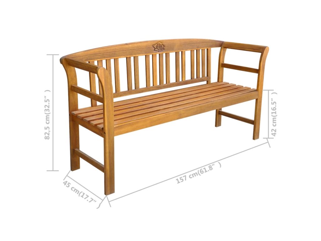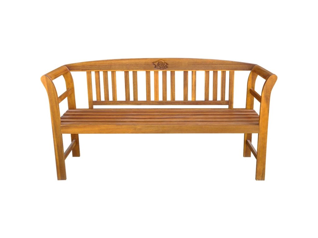Lavička s motívom ruže, ktorá je vyrytá do dreva v strednej časti operadla, predstavuje pútavý doplnok do dvora či záhrady. Lavička s motívom ruže bola vyhotovená z akáciového masívu, vďaka čomu je pevná, trvácna a vhodná do exteriéru. Operadlo a opierky na ruky poskytujú optimálny komfort pri sedení. Zaoblené opierky na ruky lavičke dodávajú elegantný vzhľad. Sadnite si a oddychujte na tejto krásnej záhradnej lavici!