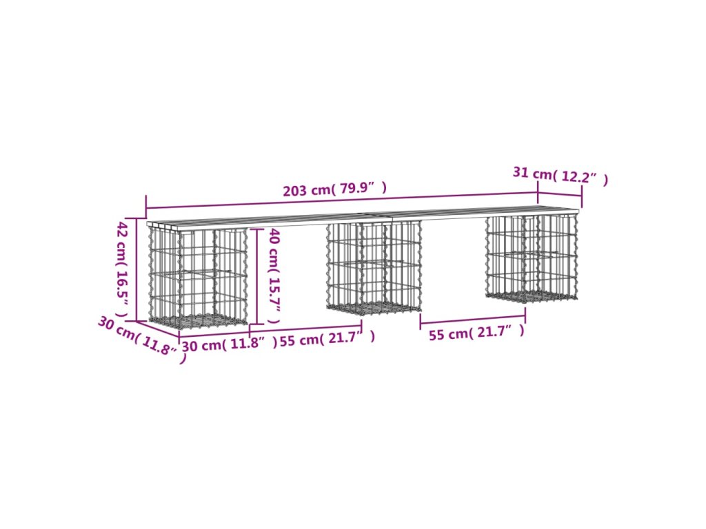 - Pevná a stabilná základňa: Táto vonkajšia lavička má základňu z koša z galvanizovanej ocele. Je navrhnutá tak, aby bola vyplnená kameňmi a štrkom pre dodatočnú krásu. Mriežku tvoria priečne a pozdĺžne drôty, ktoré sú zvarené na každom prieseku pre čo najväčšiu stabilitu.