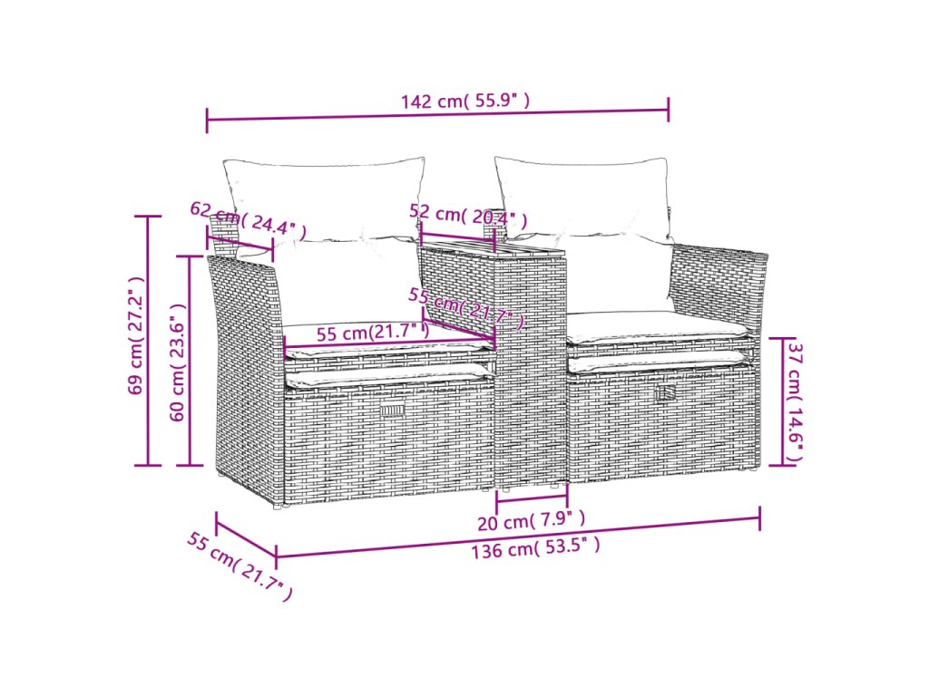 - Pohodlný centrálny stôl: Tento vonkajší nábytok je vybavený integrovaným centrálnym stolíkom, ktorý poskytuje praktické miesto na odkladanie vašich potrieb na dosah.
