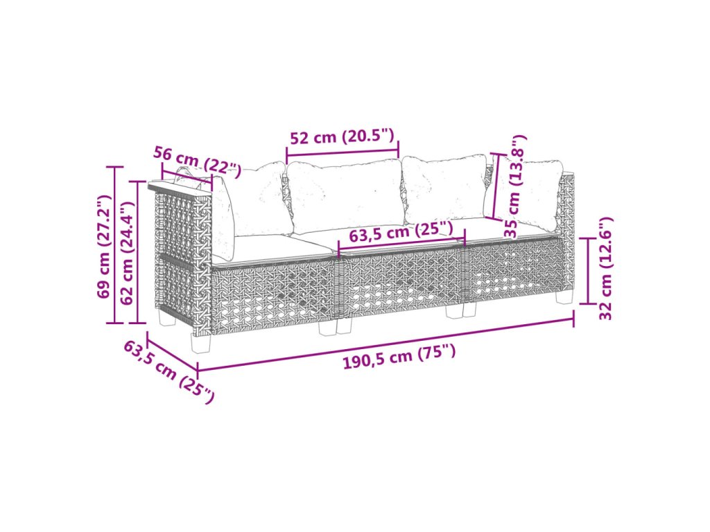 - Celkové rozmery pohovky: 190,5 x 63,5 x 62 cm (Š x H x V)