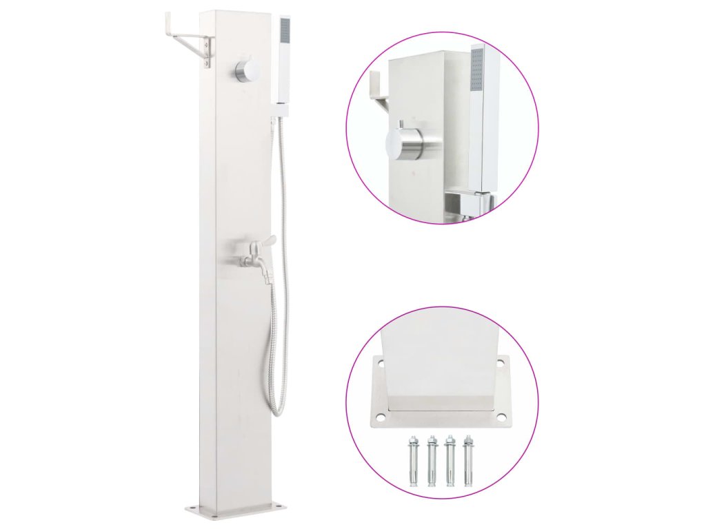 Záhradná sprcha je vyrobená z odolnej nehrdzavejúcej ocele s brúsenou povrchovou úpravou, vďaka čomu je odolná voči poveternostným vplyvom. Batéria je tiež doplnená ručnou sprchou, ktorú určite oceníte pri prácach v záhrade, zalievaní alebo rýchlej sprche. Je tiež vybavená držiakom pre jednoduché zavesenie hadice na vodu.