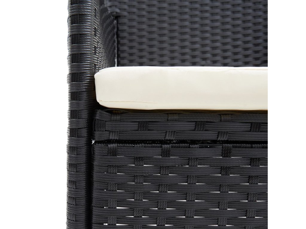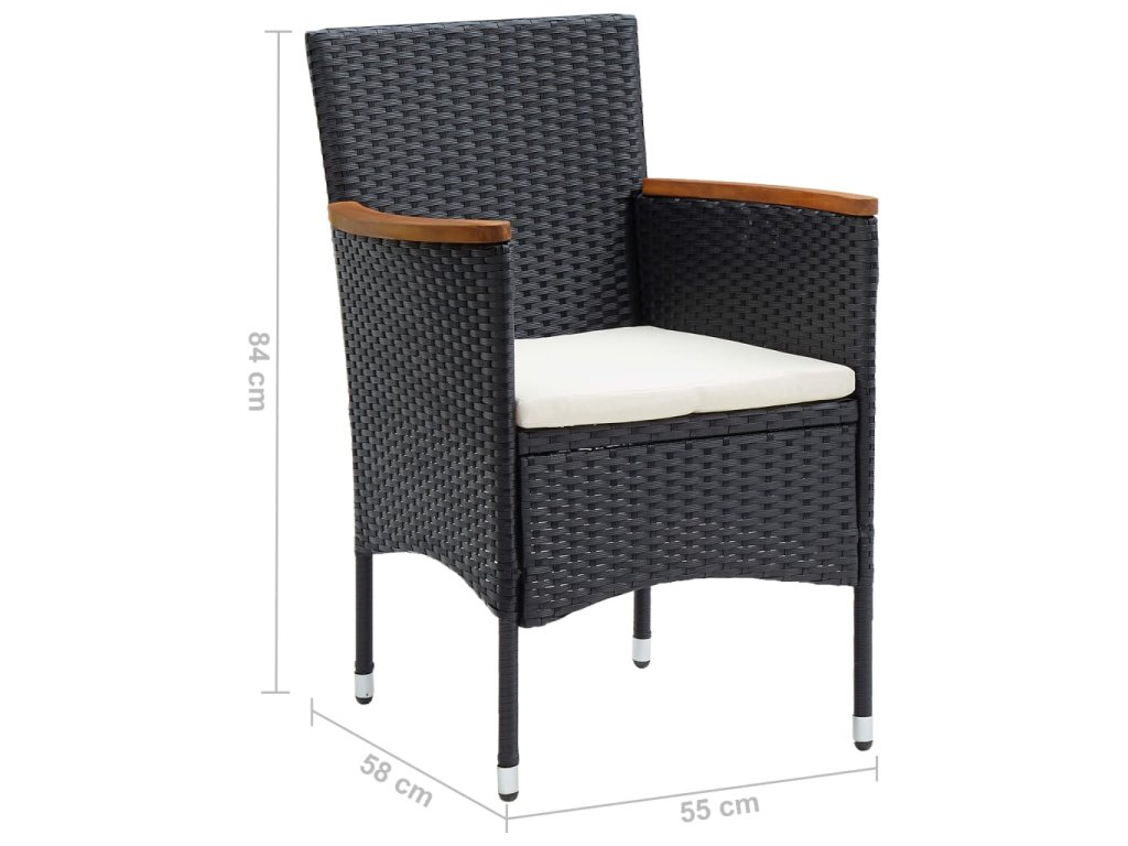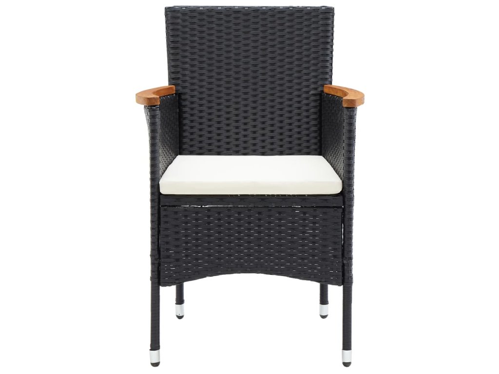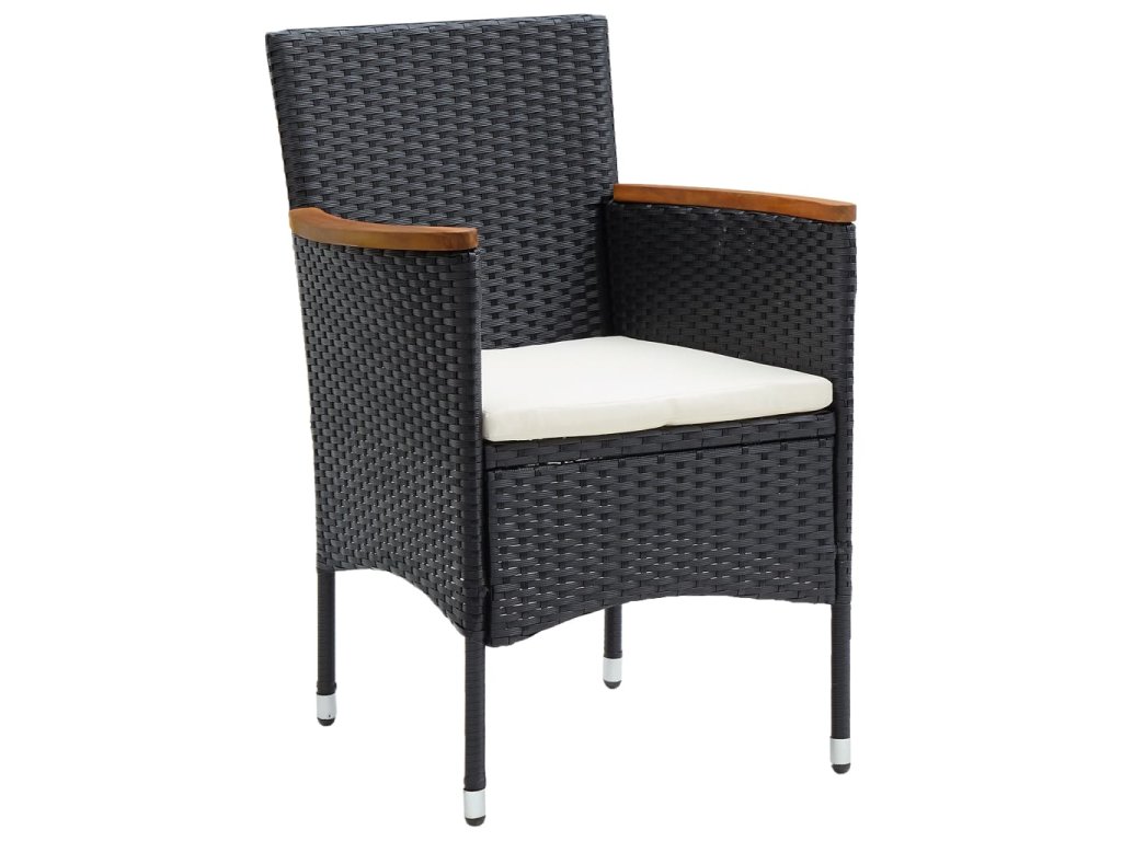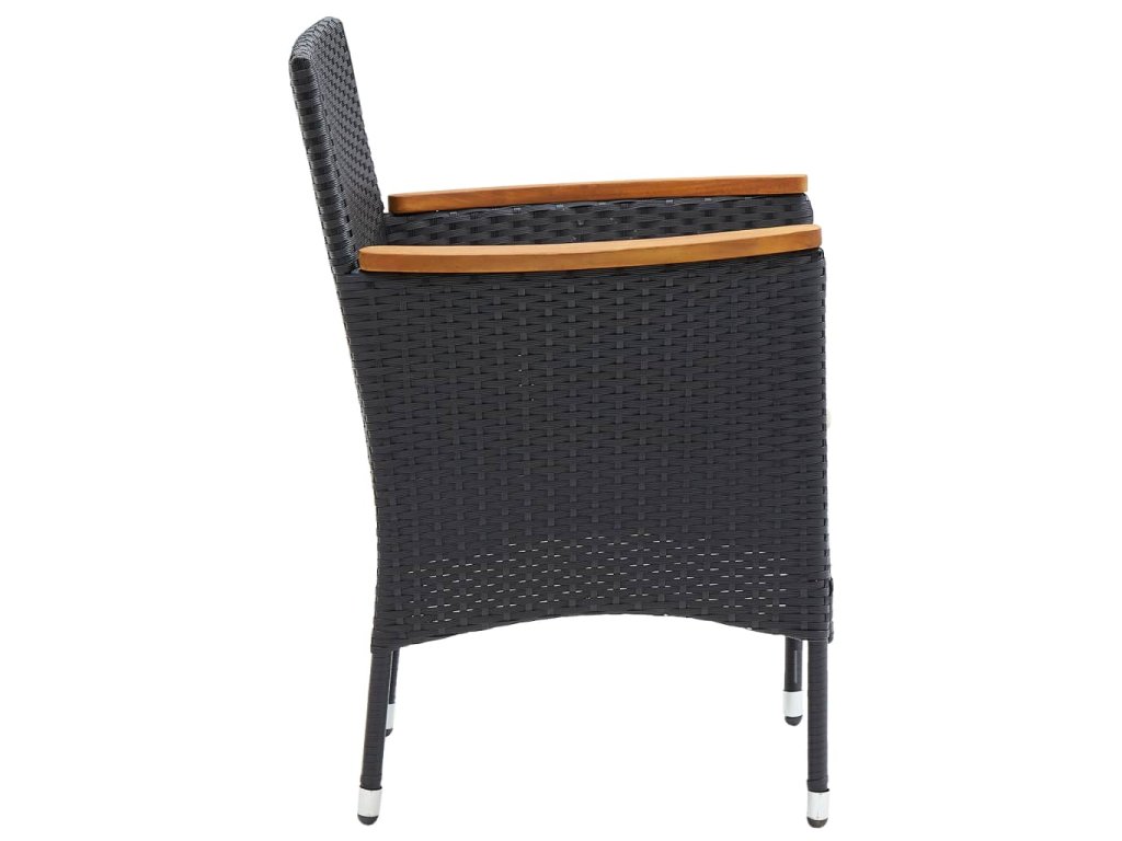 Robustný oceľový rám je obalený v PE ratane, ktorý je odolný voči poveternostným vplyvom. Táto sada záhradných stoličiek je odolná voči hrdzi a plesniam, a poskytne vám roky kvalitného odpočinku. Táto súprava vonkajších stoličiek, ktorá má zaoblené operadlo a lakťovú opierku, má ergonomický tvar pre maximálne pohodlie. Opierky sú nádherne zdobené masívnym akáciovým drevom s olejovou povrchovou úpravou, čo im dodáva rustikálny šarm. Pevné polstrované vankúše navyše poskytujú maximálne pohodlie počas sedenia.