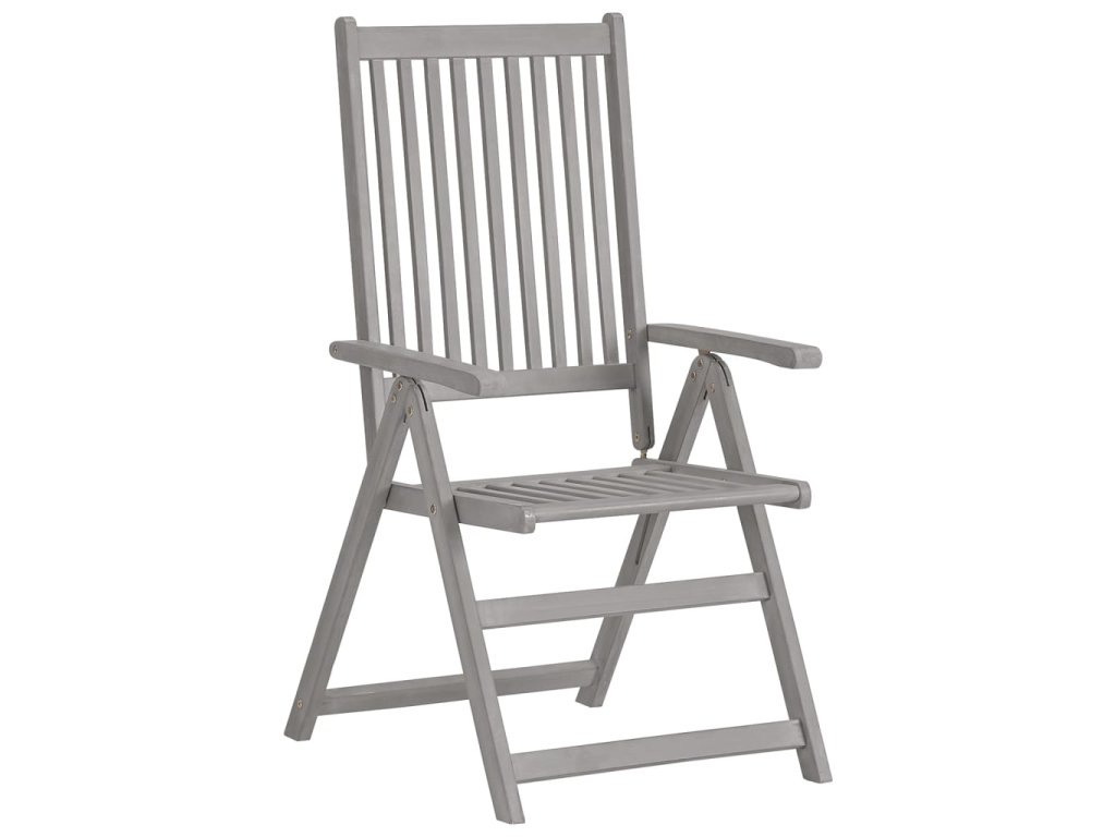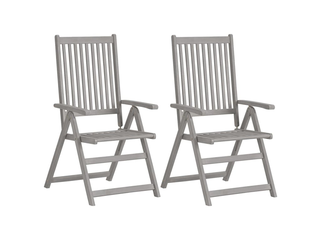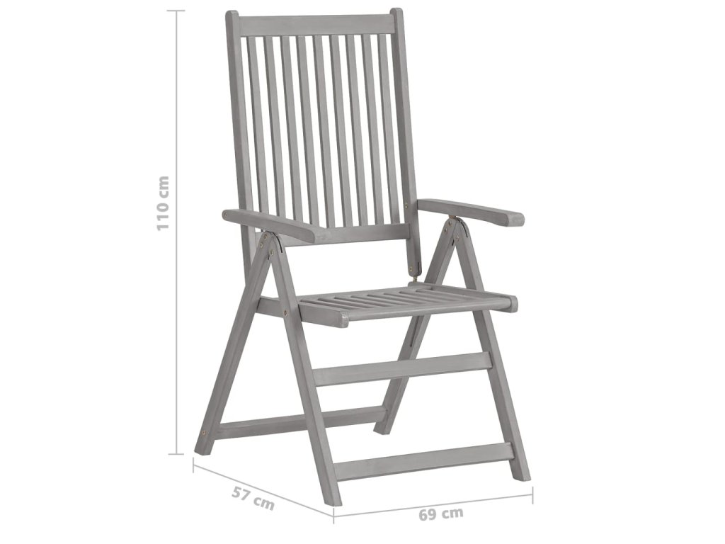 Stoličky sú vyrobené z masívneho akáciového dreva so sivou povrchovou úpravou. Je to tvrdé drevo s bohatou štruktúrou. Tieto nádherne navrhnuté záhradné stoličky sú stabilné, odolné a pútavé. Operadlo sa dá nastaviť do 5 pozícií, takže si môžete kedykoľvek nastaviť tú najpohodlnejšiu polohu podľa svojich preferencií. Navyše, pribalené vankúše poskytujú extra pohodlie pri odpočinku. Sú vyrobené zo 100% polyesteru, ktorý je upravený tak, aby bol vodeodolný. Každý vankúš má elastický pás a dve sady šnúrok, pomocou ktorých ho pevne pripevníte k stoličke.