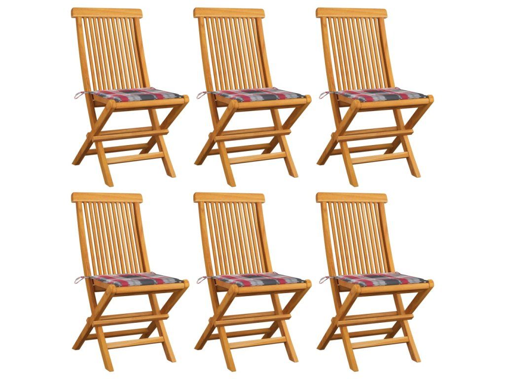 vidaXL Záhradné stoličky+červené kockované podložky 6 ks, tíkový masív