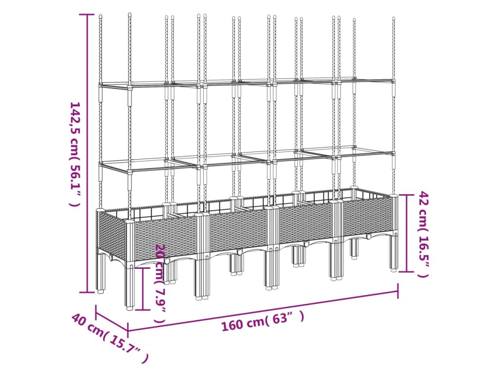 - Praktický dizajn: Ideálna spodná vrstva pomáha zadržiavať vlhkosť a umožňuje odtok vody. Integrovaná mriežka tiež ponúka skvelú podporu pre pestovanie popínavých rastlín, ako sú paradajky, hrach a ruže.