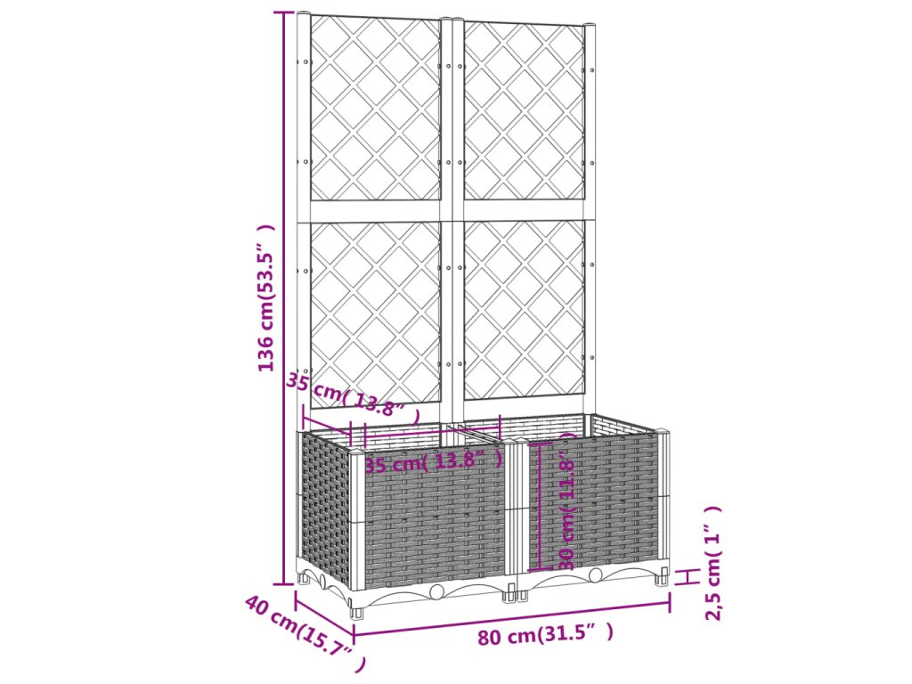 Tento kvetináč je vyrobený z PP odolného voči poveternostným vplyvom, je pevný a vhodný na vonkajšie použitie. Do spodného boxu sa zmestí veľké množstvo zelených rastlín a kvetov. Integrovaná mriežka ponúka skvelú podporu pre pestovanie popínavých rastlín, ako sú paradajky, hrach a ruže.
