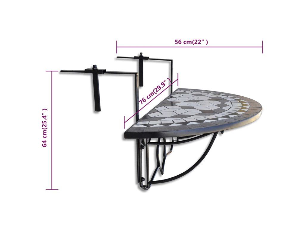 Železný rám stolíku dodáva potrebnú pevnosť a keramická doska v tvare polkruhu sa dá jednoducho očistiť. Stolík na balkón sa dá namontovať na akúkoľvek terasu či balkón so zábradlím so šírkou do 18 cm. Dá sa jednoducho sklopiť, keď sa nepoužíva, aby nezaberal veľa miesta. Upozorňujeme, že nie je vhodné výrobok nechávať vonku v chladnom počasí.